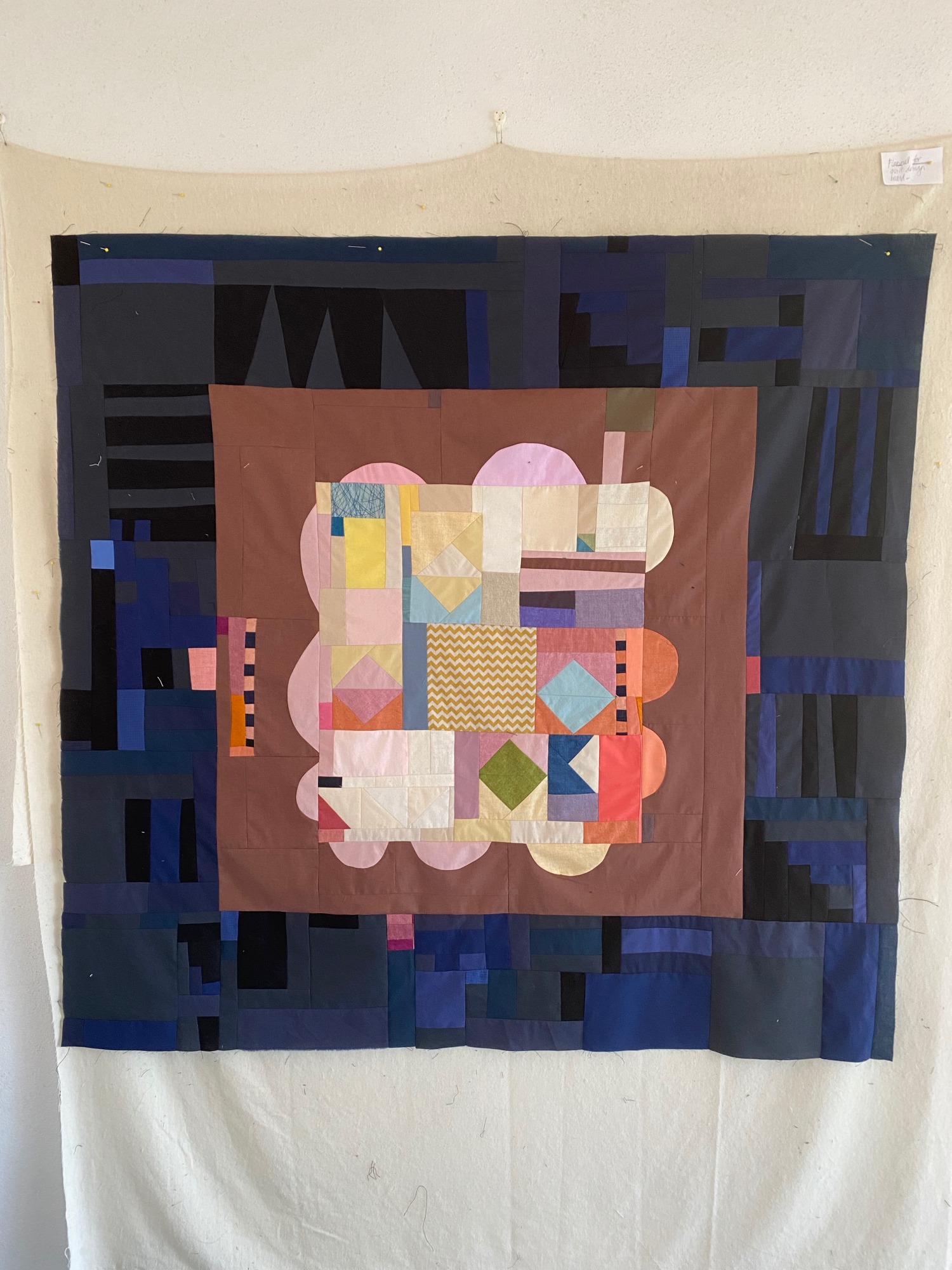 Improv quilt top using recyled mens shirts and various cotton fabrics