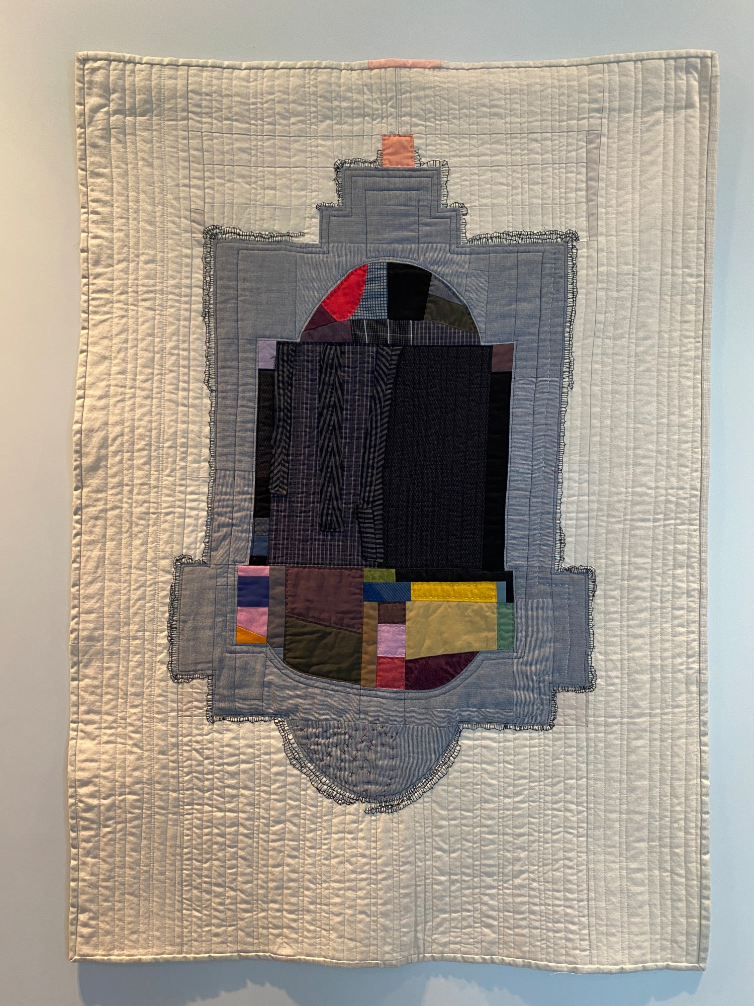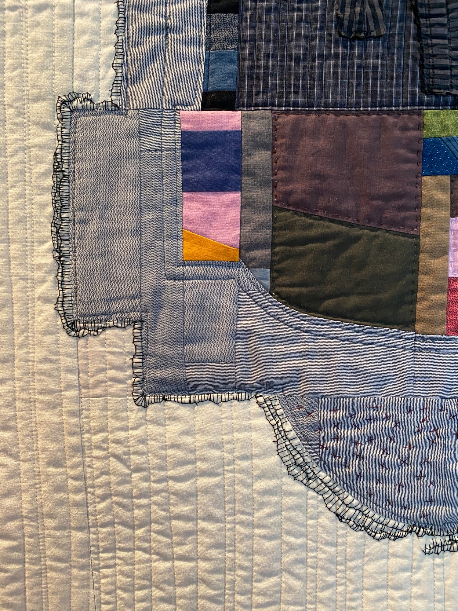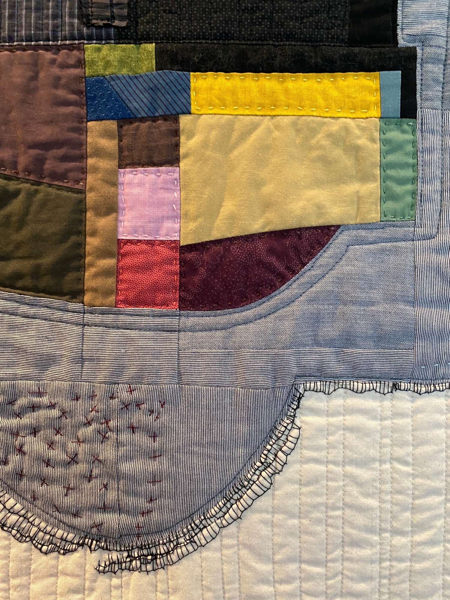 Improv quilt using up cycled mens shirts and commercial cottons. Machine pieced and machine and hand quilted. Hand embroidery.