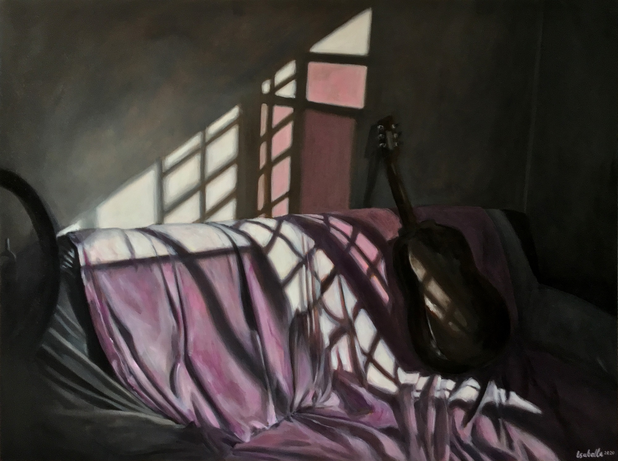 This painting emerged from the time I spent at home, watching the fascinating interplay of light and shadow across my living room wall. The afternoon sun trickled her fingers daily across my sofa, the only guest my family and I was allowed.