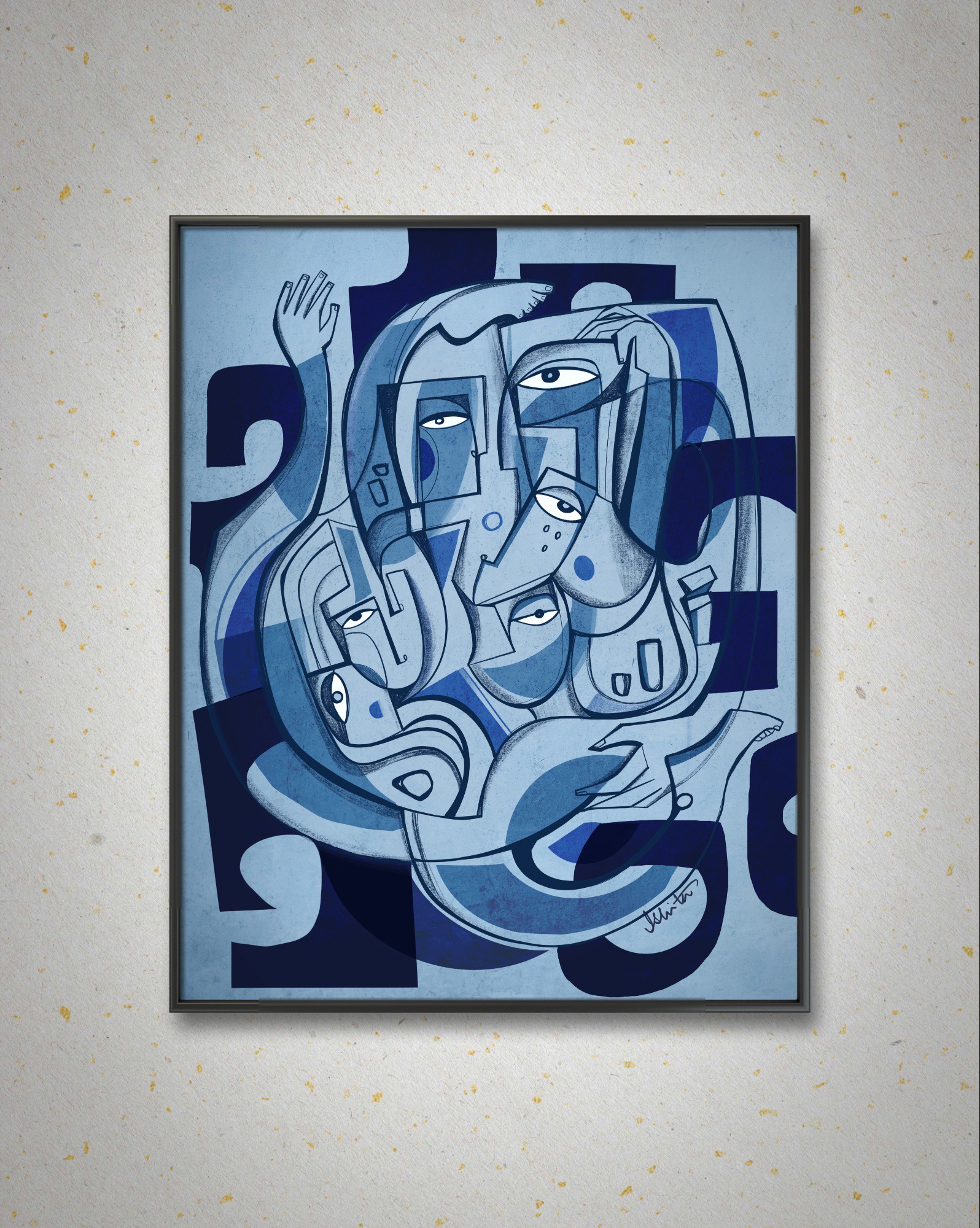 Loosely flowing, deconstructed, Cubist painting of inter-twined bodies by Ishita Banerjee, rendered in mineral blues. An interpretation of how we exist within pockets of spaces, of negative and positive shapes, between forms and emotion. A densely interwoven composition, rife with macro and micro nuanced expressions of human existence.