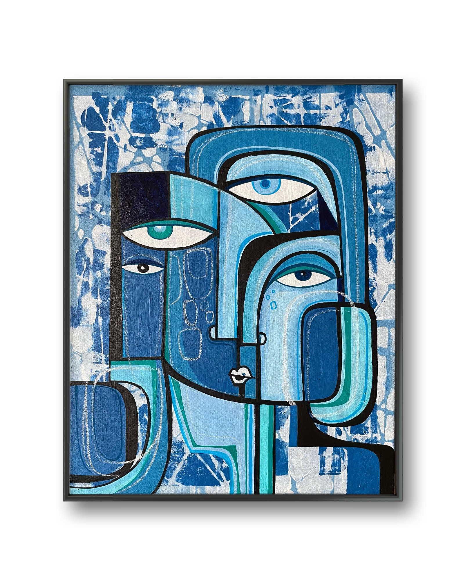 Modern Cubist expressionist painting of inter-twined faces by Ishita Banerjee, rendered in moody mineral blues. Blues is a depiction of the interdependent relationship between people and their stories that flow into one another.