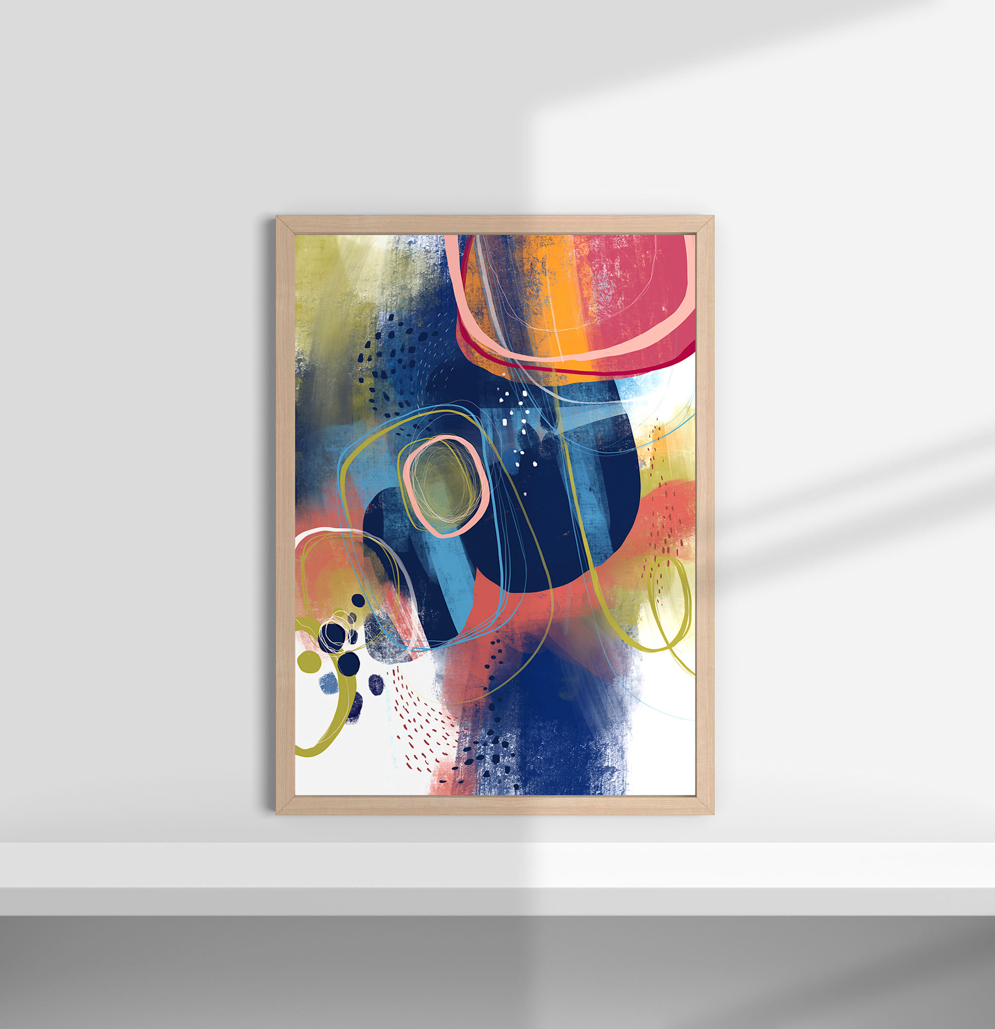 Abstract shapes meets nature in this colorful and contemporary art print reminiscent of pebbles in a pond as they make ripples while sinking into the depths of the deep waters.