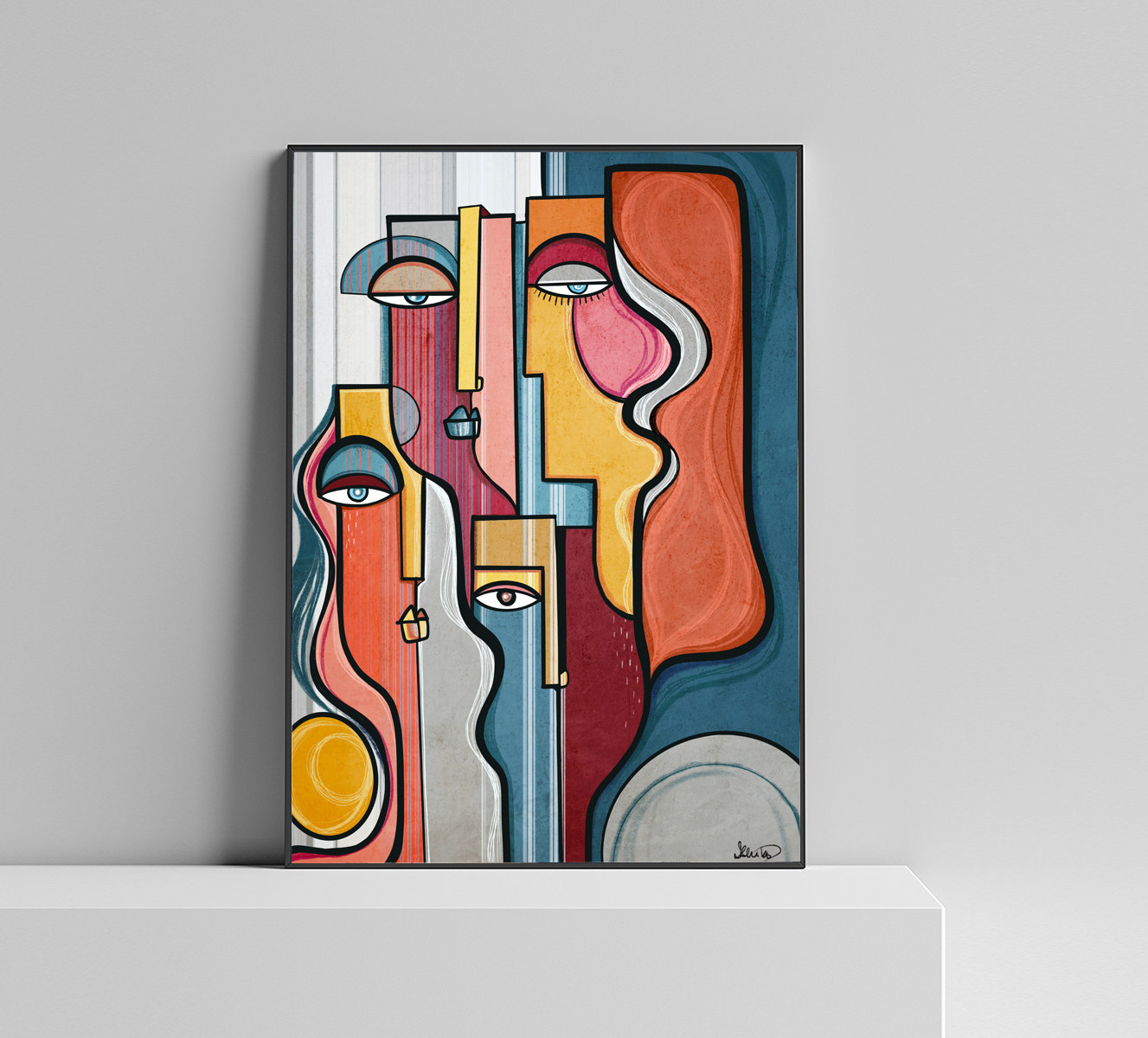 Modern, Cubist style faces in sunset colors, superimposed forms and flowing lines, come together to make a statement in this unique, one of a kind art print that adds a modern day, vintage glamor to your decor.