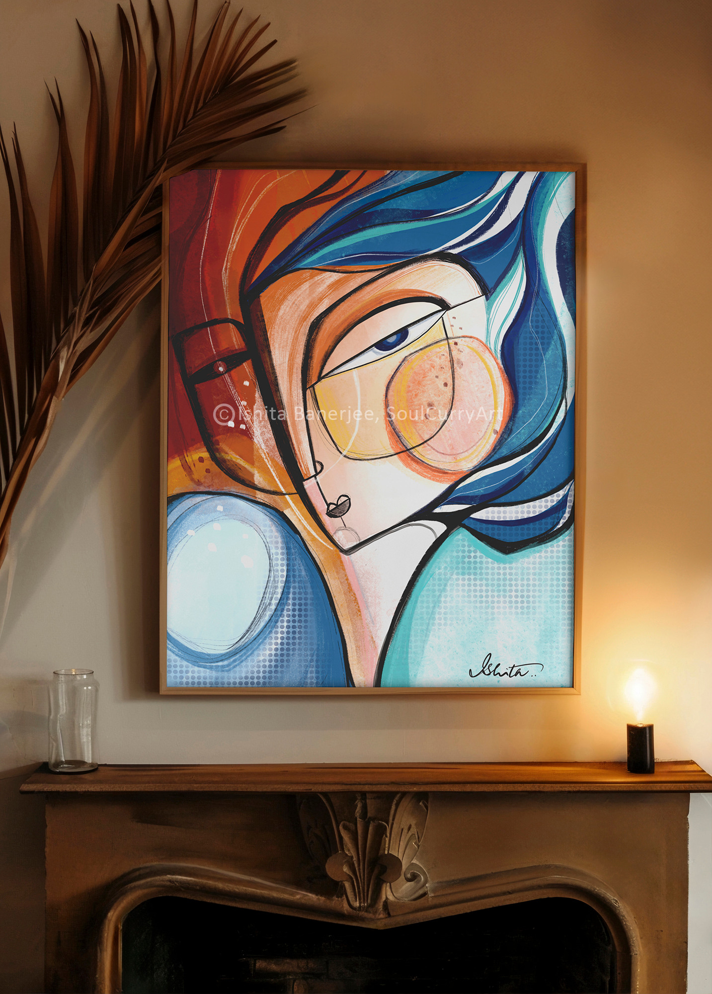 Modern, Cubist style faces in sunset colors, superimposed forms and flowing lines, come together to make a statement in this unique, one of a kind art print that adds a modern day, vintage glamor to your decor.