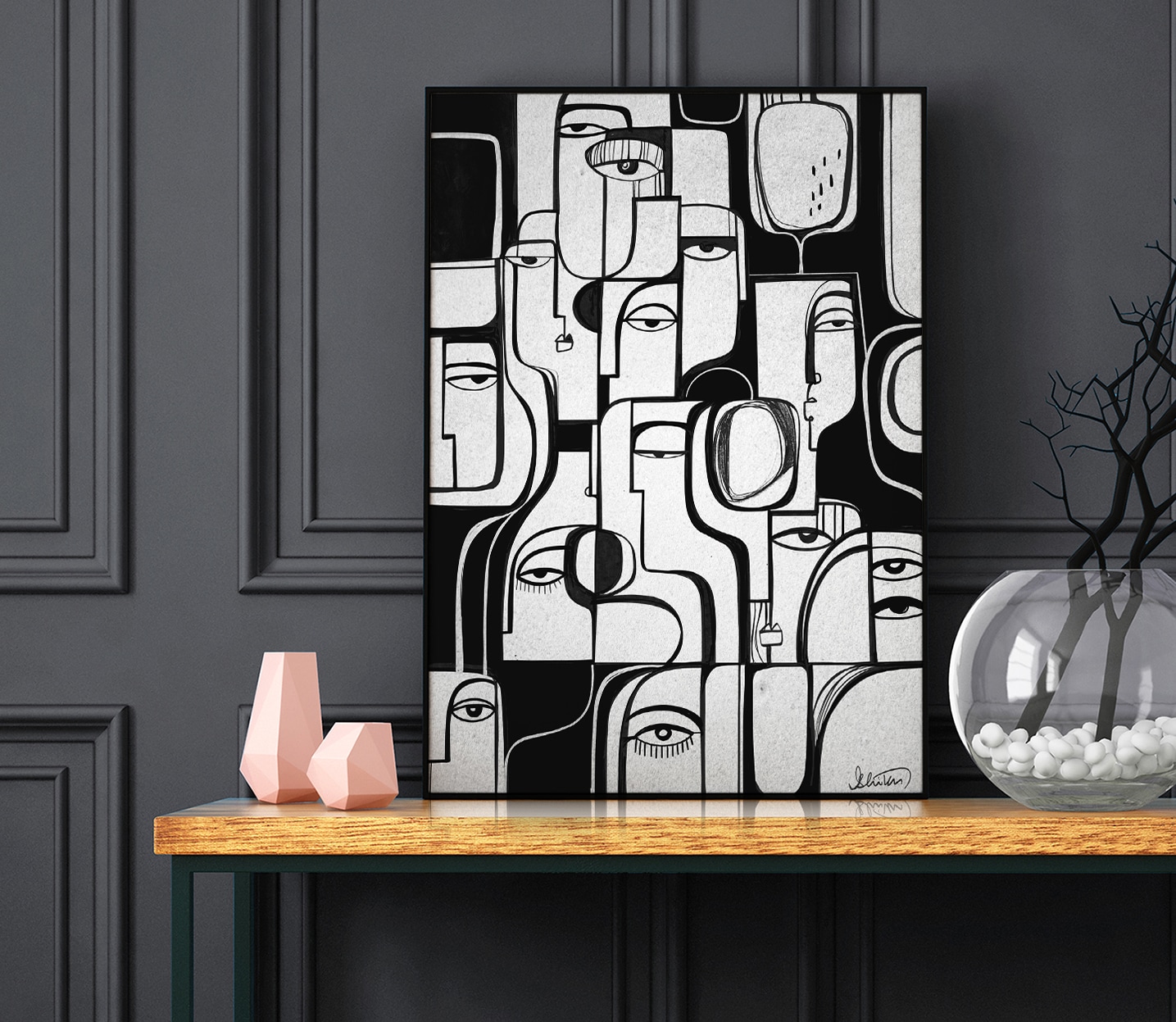 Modern, Cubist style faces in bold black and white, superimposed forms and flowing lines. come together to make a statement in this unique, one of a kind art print that adds a modern day, vintage glamor to your decor.