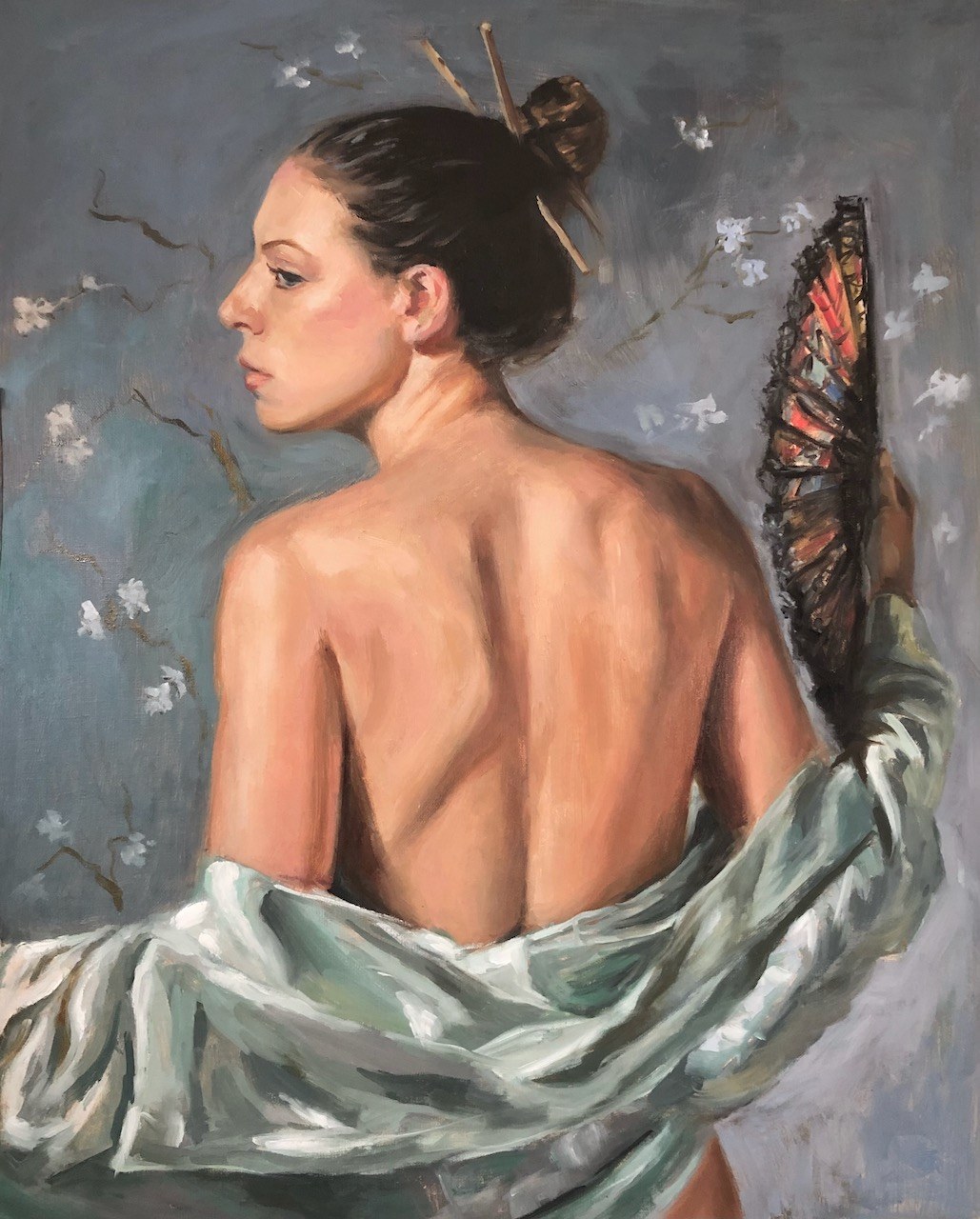 A Japanese inspired motif of a young woman putting her kimono on, holding a fan, against a background of a cherry blossom wallpaper.