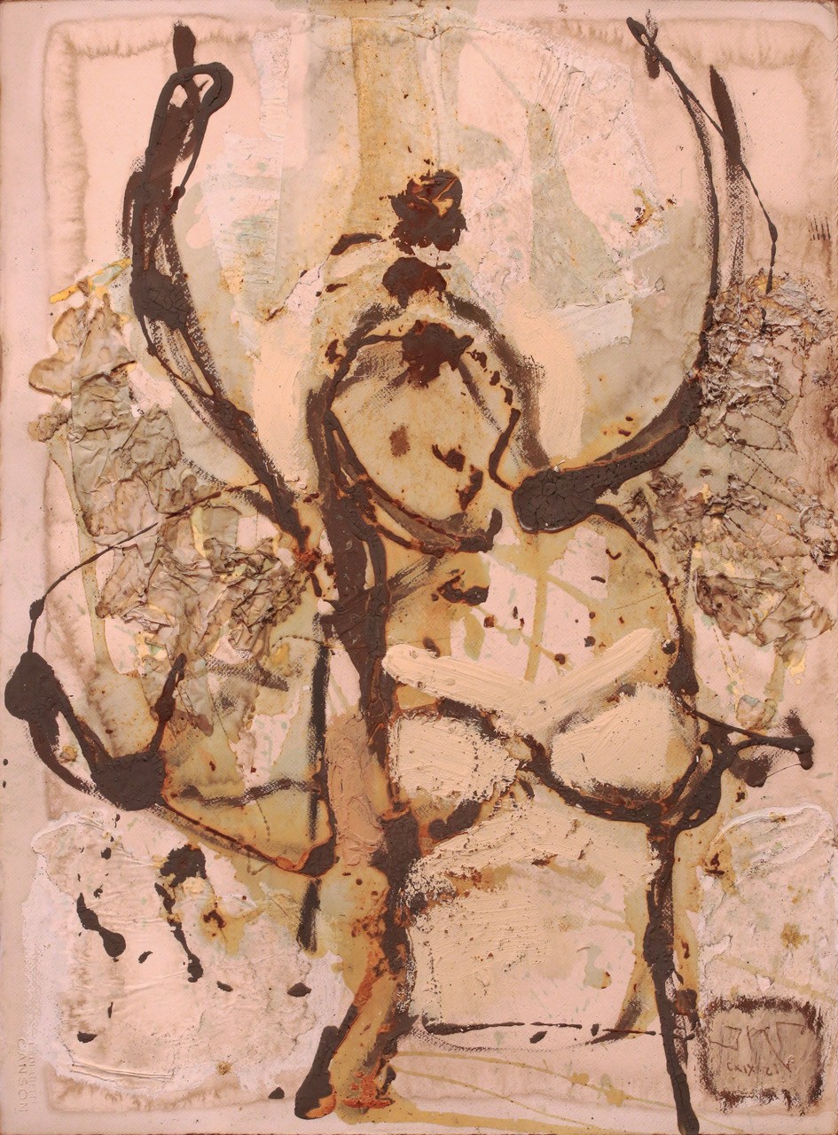 - Paper, latex paint, acrylic paint, coffee, wood glue, iron, and rust