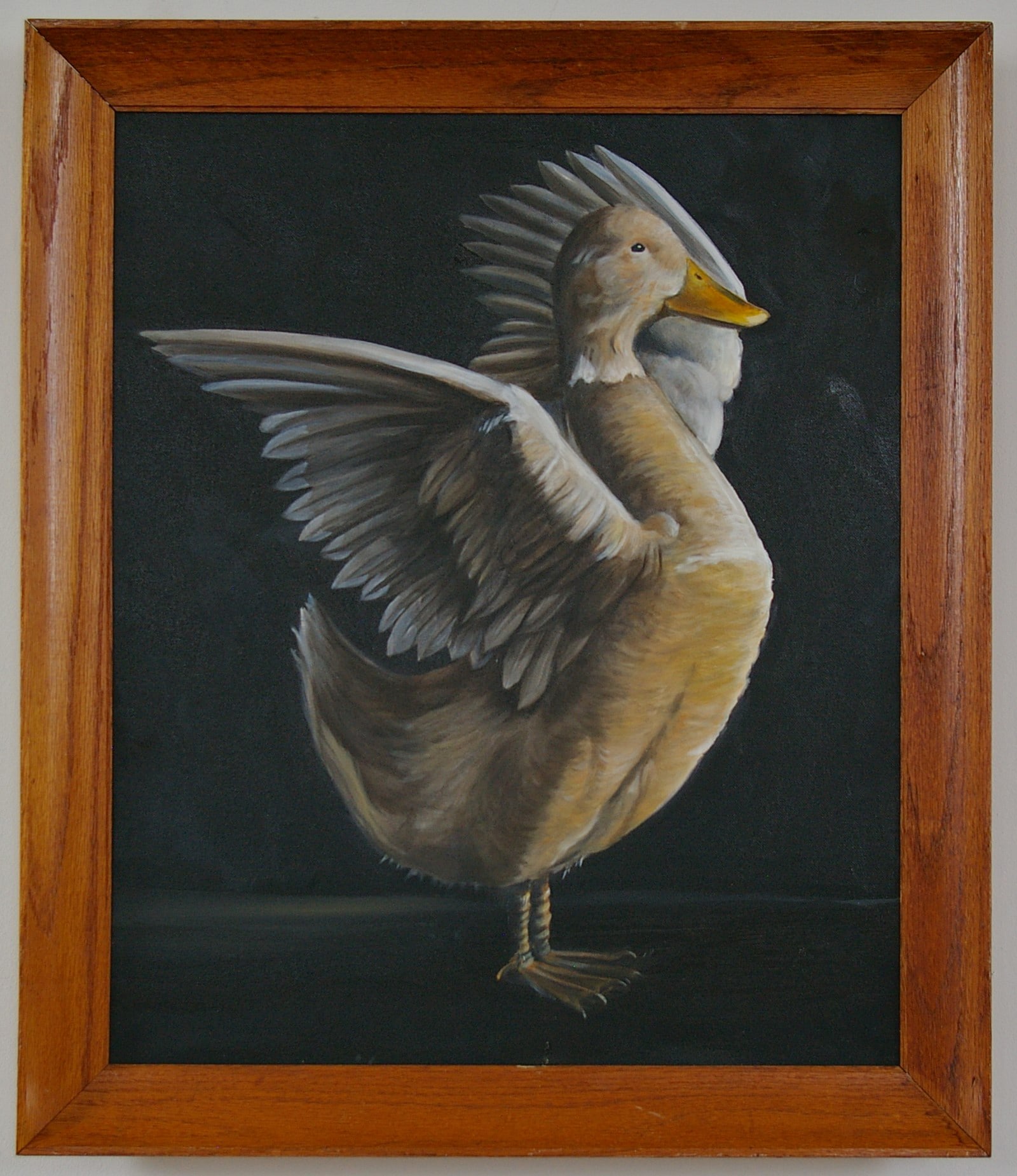 This oil on canvas in a Vintage frame is a portrait of my own duck. She is a Buff Orpington who has a slightly bent neck from being attacked by a mink.
