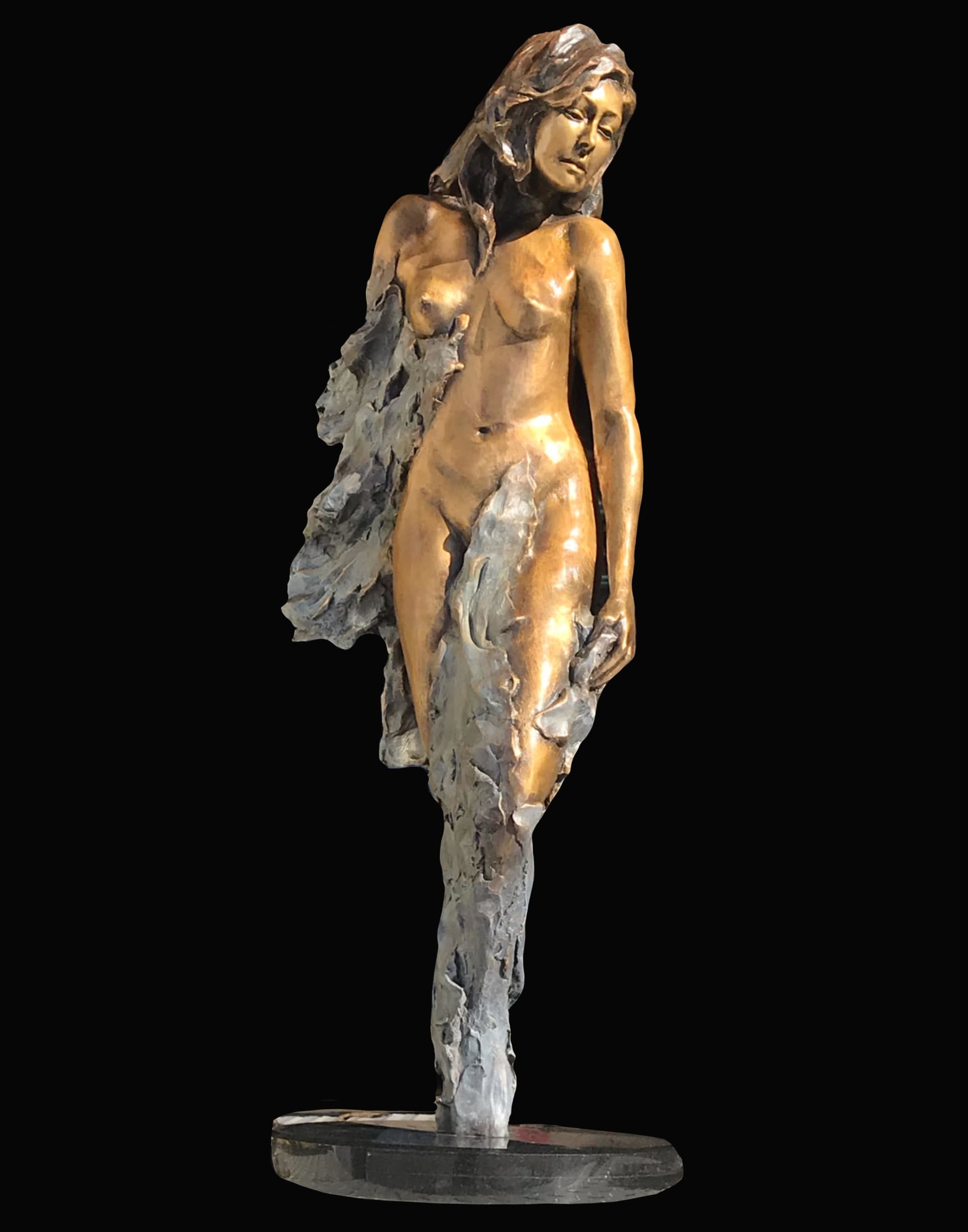 The woman’s pose is equally striking, with her head tilted slightly to one side, exuding poise and elegance. The sculpture exudes a sense of movement and freedom, making it a stunning representation of the human form and the power of art to capture its beauty.