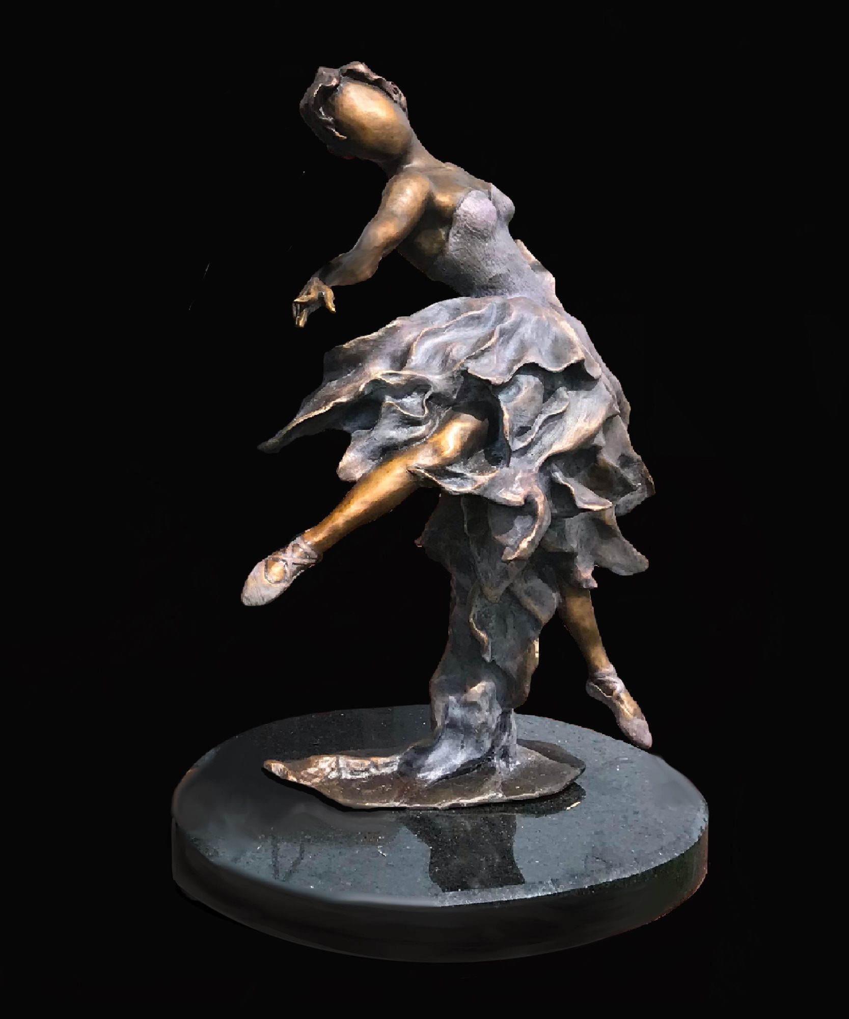 SOFT MELODY is one of my pride and joy. In creating this piece, I pushed my limits and the limits of bronze. I aligned three beautiful ballerinas in different graceful poses, with their legs and arms positioned strategically to create the sense of movement and the sense of music flowing through the dancers. None of the dancers touch the ground, all three are sculpted in different expressive poses, dancing tirelessly to the music. Only one of the dancer’s dresses touches the ground, allowing the sculpture to be supported. The fabric of the dress from the third dancers flows in a cascading ripple giving the sense of continuous movement. The chosen patina, a soft whisper of pink, adds to the delicate feeling of this sculpture. The editions will be 20 artists proof plus 195 open editions for a total of 215 pcs.