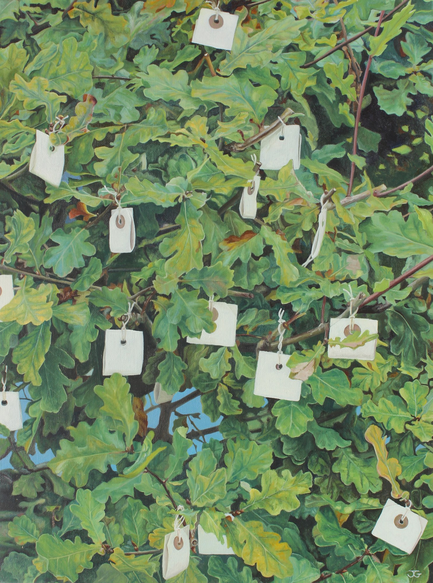 We are inherently superstitious; toss coins in fountains for luck, leave padlocks on bridges to secure a relationship…. This painting focuses on individual’s wishes and desires and how we gain comfort from being part of a collective activity, something bigger than ourselves. On close inspection the adorned ancient oak tree revels itself to be the guardian of neatly folded and hidden desires, a wish tree. Being based in Sevenoaks, this ancient tree has particular significance to me.