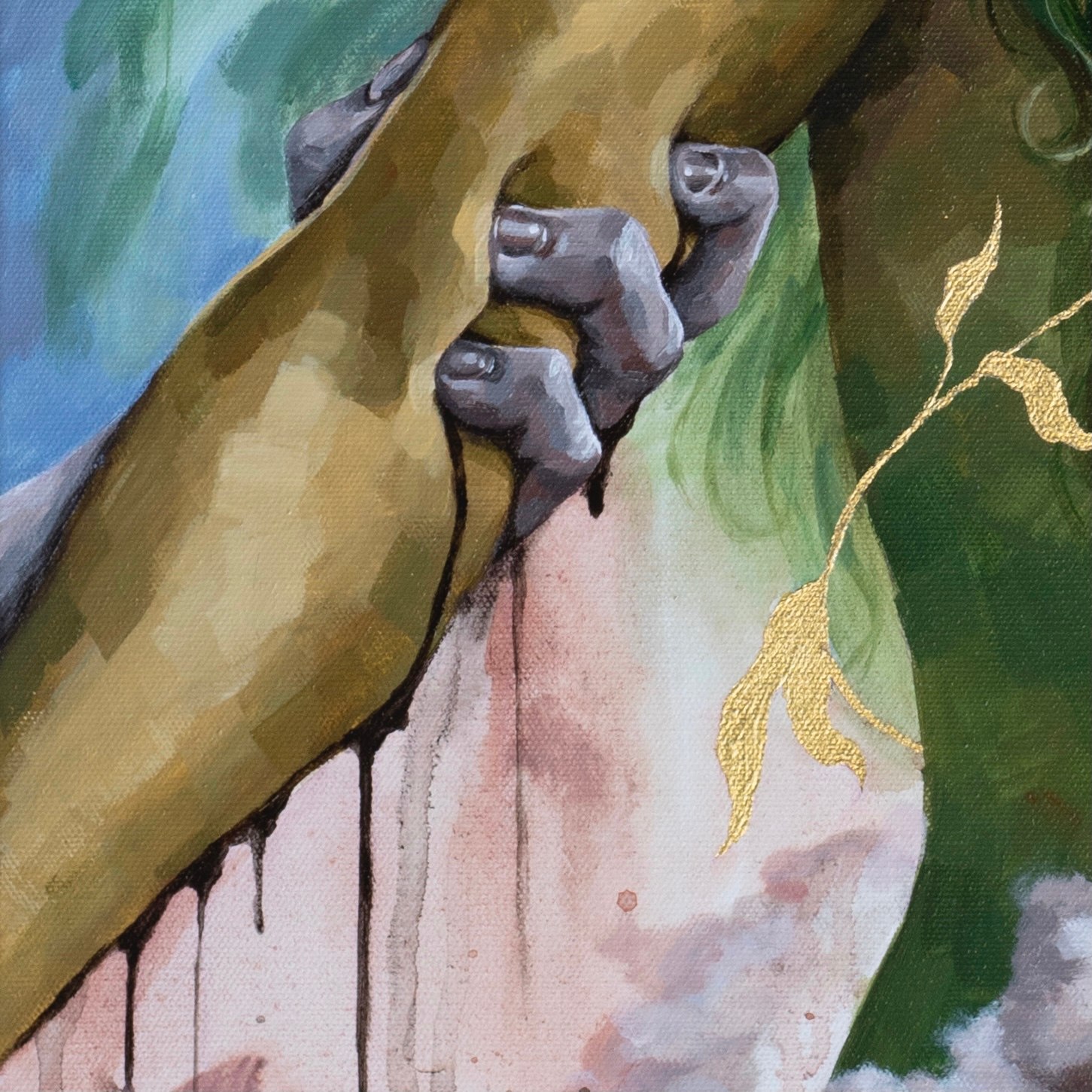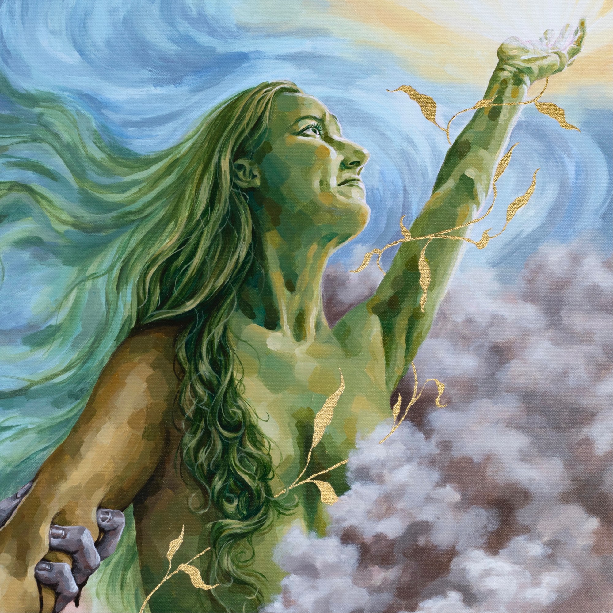 Anthropocene depicts the struggle for environmental justice and a liveable future amidst the climate catastrophe wrought by late-stage capitalism. Despite the destruction, extraction, and exploitation that reign below, a hand reaches upward toward the light – toward hope.