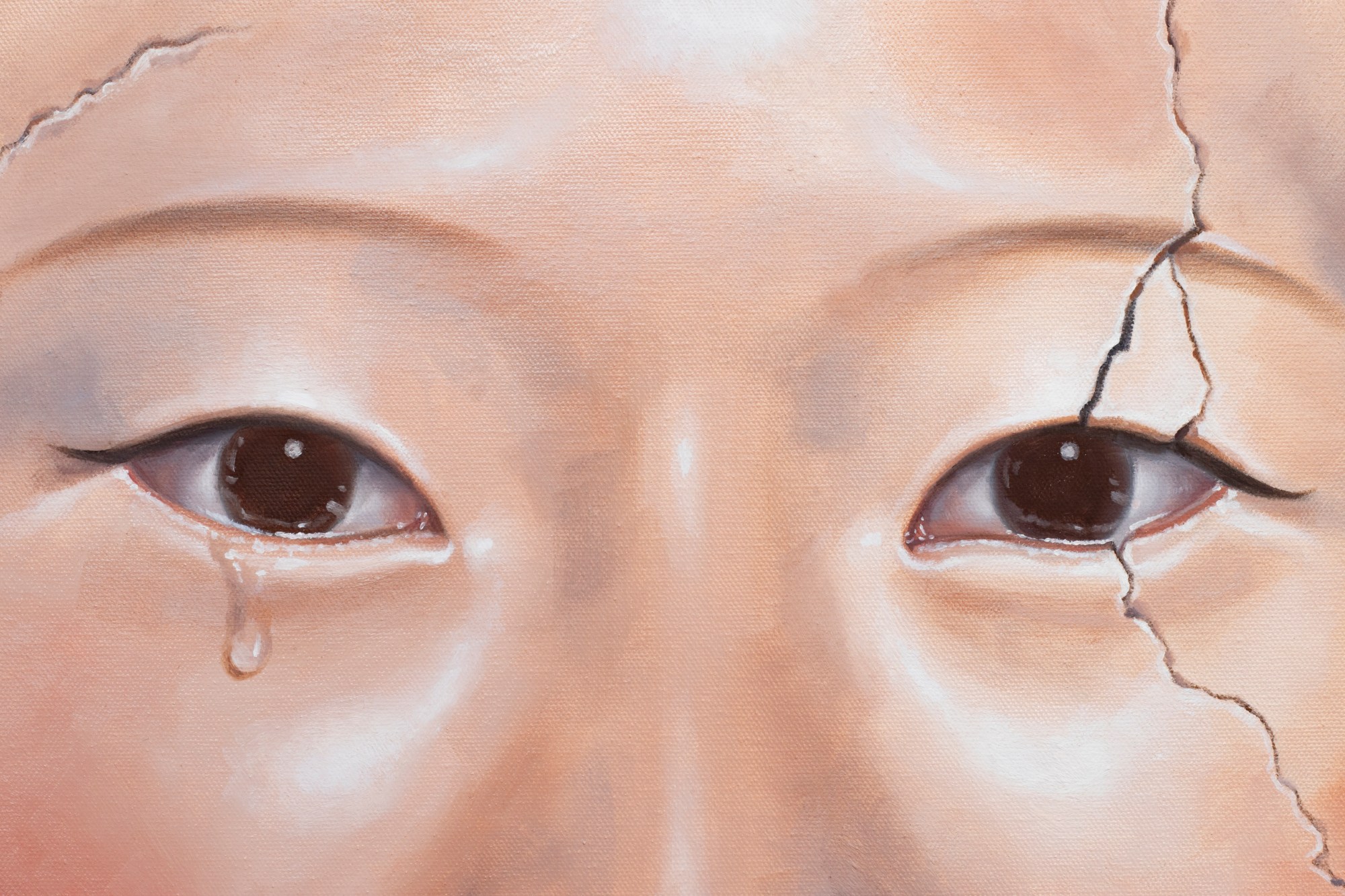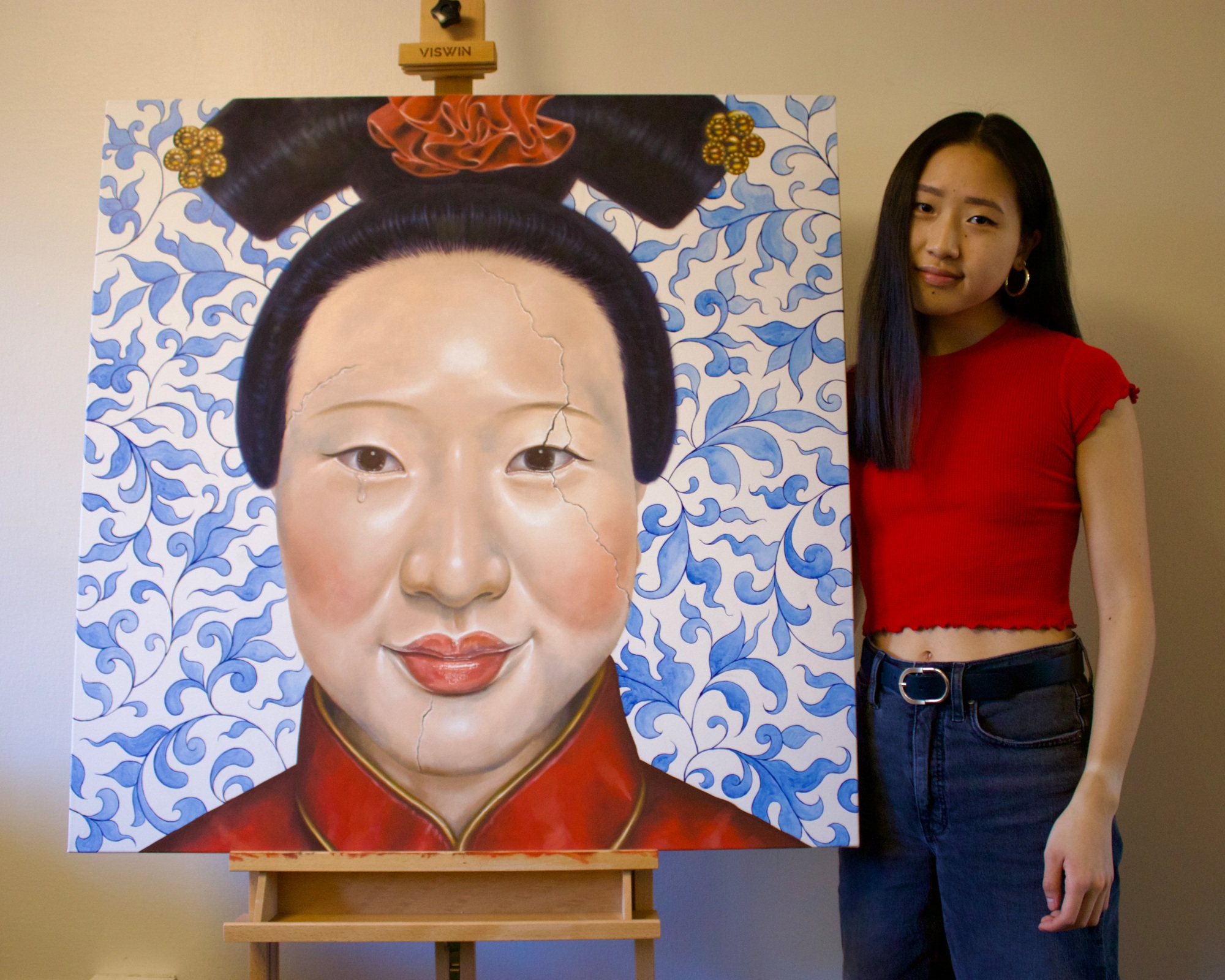This piece investigates my complex, fractured relationship to Asian American identity and womanhood, informed by the broader contexts of objectification and orientalism. The Oxford English Dictionary defines “Chinoiserie” as “the imitation or evocation of Chinese motifs and techniques in Western art, furniture, and architecture.” In this quasi-self-portrait, I transform myself into a china doll, a caricature of the Western oriental fantasy.