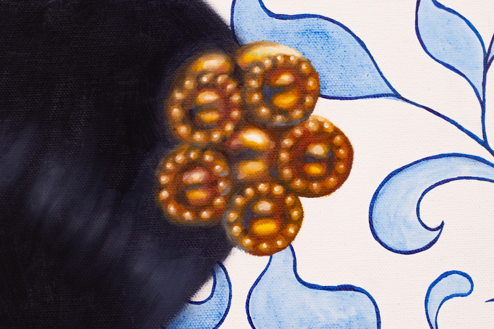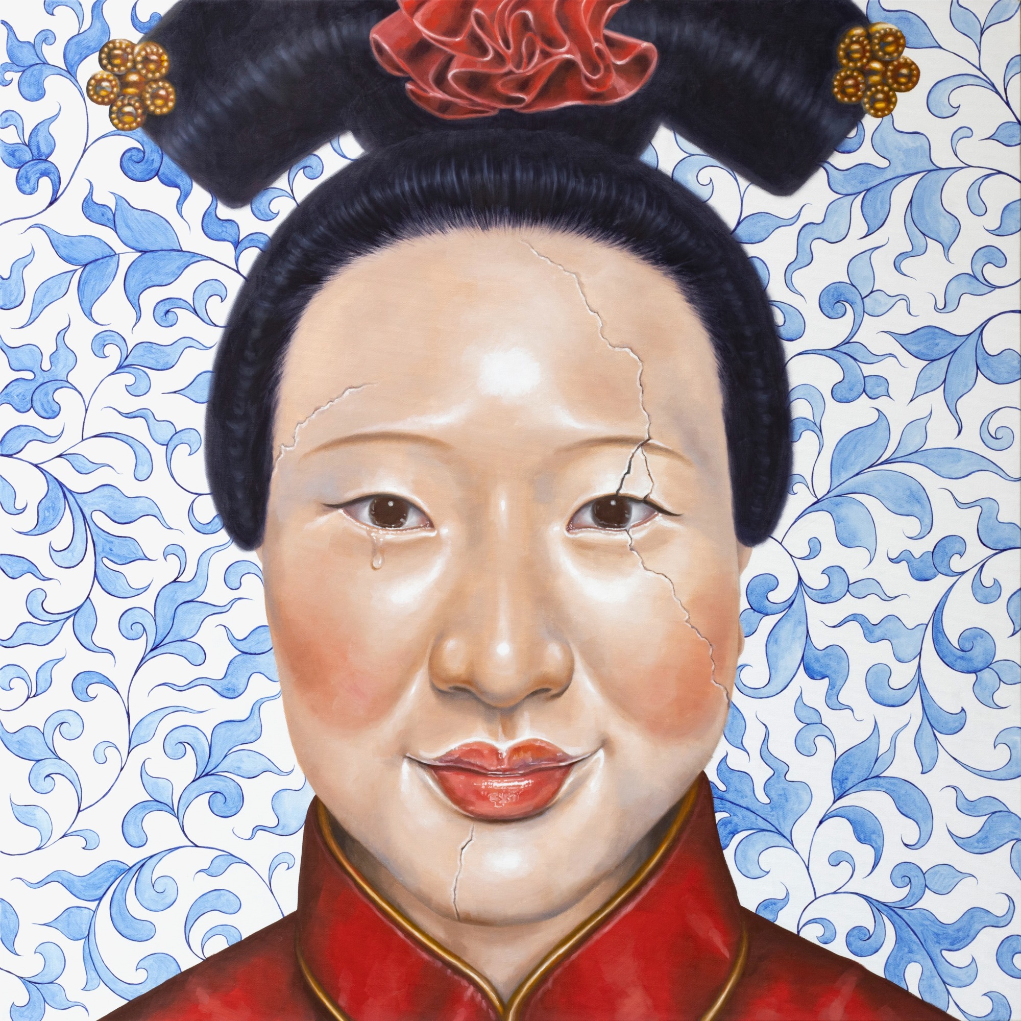 Visual inspiration primarily derives from a composite of “Chinese porcelain doll” stock photos and Qing dynasty fashion, as well as Risso and Browne’s lithograph depicting Afong Moy, the first known Chinese woman to arrive in America, who was put on exhibit in New York as an exotic spectacle. The background’s decorative florals reference the stereotypically-Chinese blue and white porcelain, a material whose history is deeply embedded in trade linkages and geopolitics between Europe and Asia.