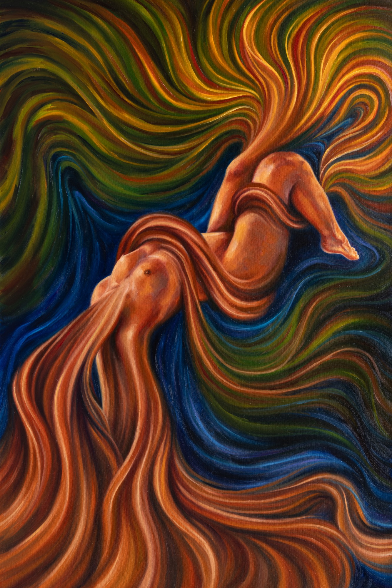 Through painting, I seek to visually affirm a fundamental oneness: we ARE the Earth, not separate from it. In my compositions, the intertwined human and arboreal bodies collapse binaries between nature and culture, human and nonhuman, self and other, individual and collective. The work of restoring kinship with the more-than-human world is the work of widening our circles of compassion – beyond self, beyond family, beyond nation – to encompass the entire planet. Grounded in an expansive reciprocity, interdependence, and care, "Arborescence" seeks to make space for both grief and hope in the face of ecological crisis.