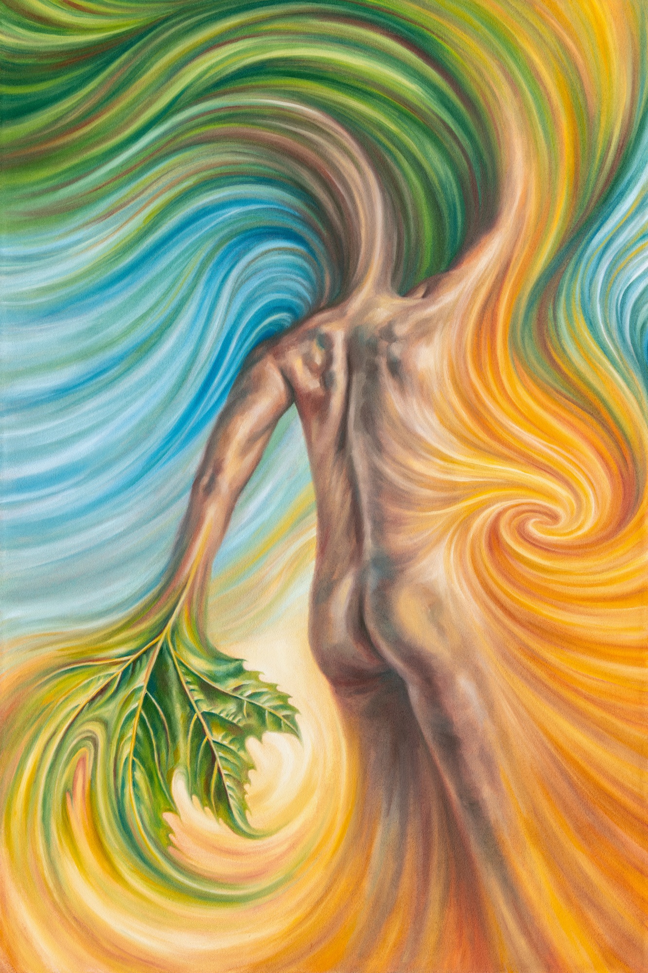 Through painting, I seek to visually affirm a fundamental oneness: we ARE the Earth, not separate from it. In my compositions, the intertwined human and arboreal bodies collapse binaries between nature and culture, human and nonhuman, self and other, individual and collective. The work of restoring kinship with the more-than-human world is the work of widening our circles of compassion – beyond self, beyond family, beyond nation – to encompass the entire planet. Grounded in an expansive reciprocity, interdependence, and care, "Arborescence" seeks to make space for both grief and hope in the face of ecological crisis.