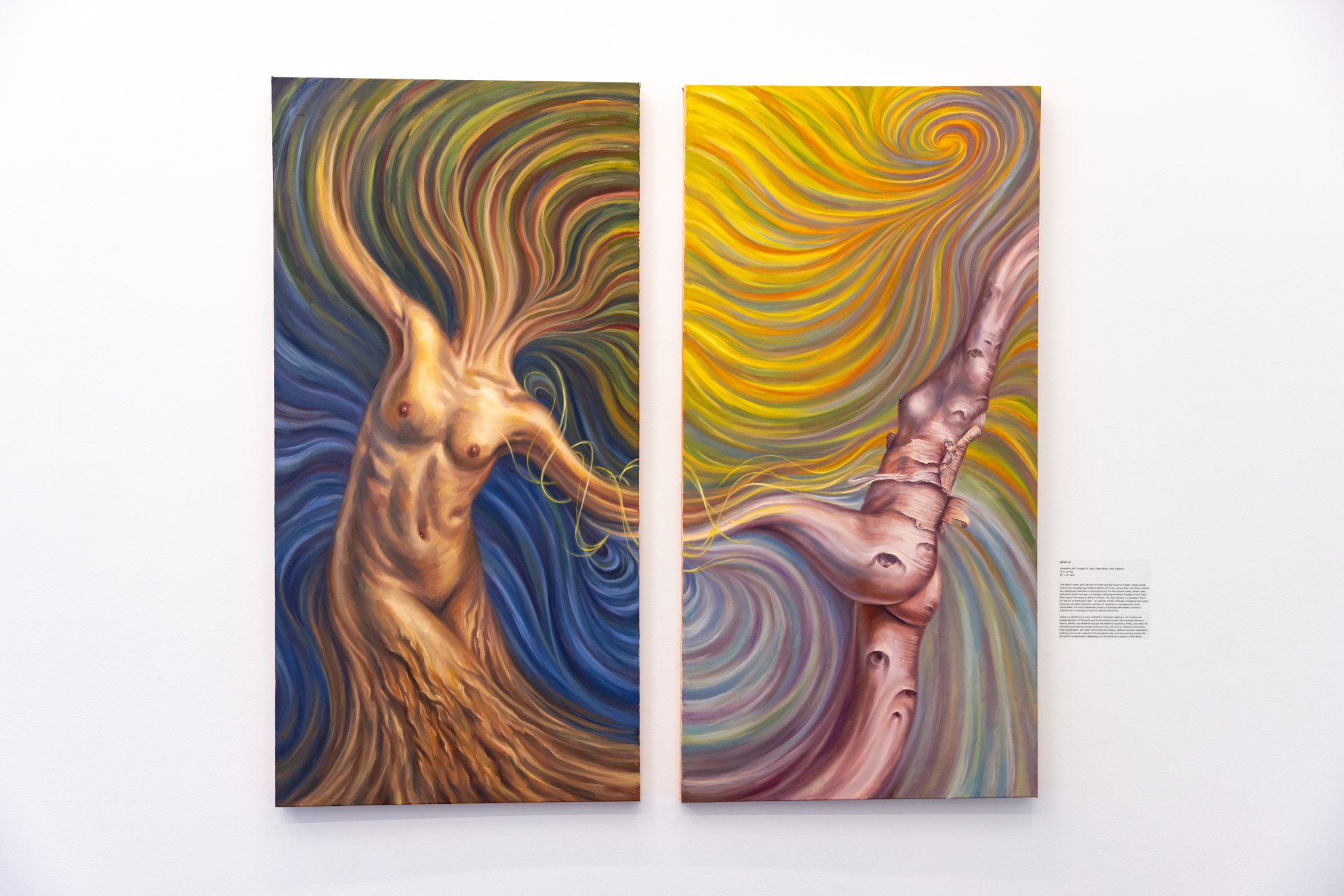 Through painting, I seek to visually affirm a fundamental oneness: we ARE the Earth, not separate from it. In my compositions, the intertwined human and arboreal bodies collapse binaries between nature and culture, human and nonhuman, self and other, individual and collective. The work of restoring kinship with the more-than-human world is the work of widening our circles of compassion – beyond self, beyond family, beyond nation – to encompass the entire planet. Grounded in an expansive reciprocity, interdependence, and care, "Arborescence" seeks to make space for both grief and hope in the face of ecological crisis.