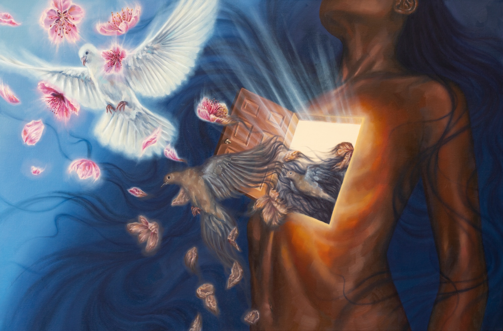 Forgiving is hard – even when you truly want to. The process is riddled with bitterness, loss, and risk, but also promises potential healing and new beginnings. Opposing forces compete in this painting: luminosity and shadow, serenity and grief, flourishing and withering, redemption and regression. A soaring white dove is shadowed by its darker inverse, mourning doves. Ping Guo Hua (apple blossoms) are symbols of peace and healing, used in traditional Chinese medicine to restore balance in the body. Across the canvas, they atrophy, sink, and dissipate into wisps of shadow, or float in full bloom, emitting rays of light like little suns. The journey of forgiveness is fraught, protracted, and far from linear. But trying to forgive is often the first step toward dispelling ghosts of the past and healing from personal and collective trauma.