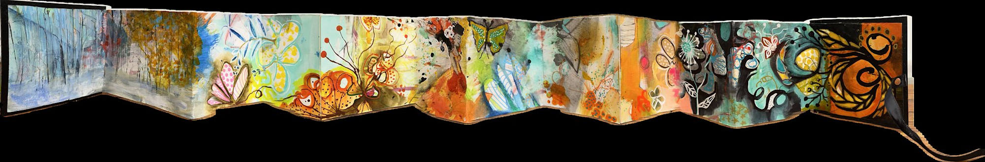 This Concertina is created from a single sheet of paper that is folded to create a book. However not all Concertina books are created using the same method. Many artists cut and bind the paper, but the general premise is to provide an expanded view. Two, four, or six, or more pages that can be visible at any particular time, rather than the limited spread available in the traditional sketchbook.