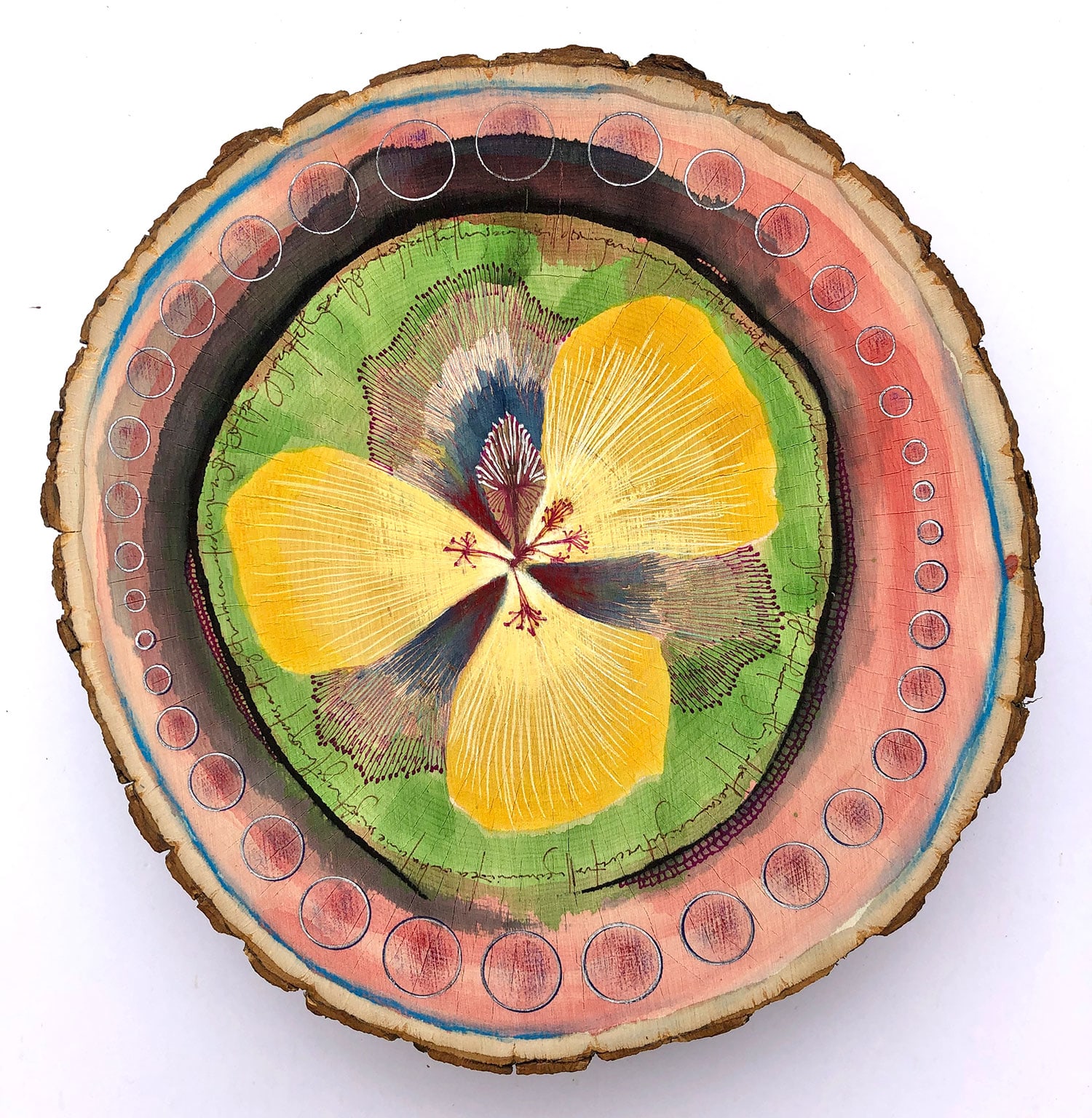 Ink and pastel on basswood tree slice