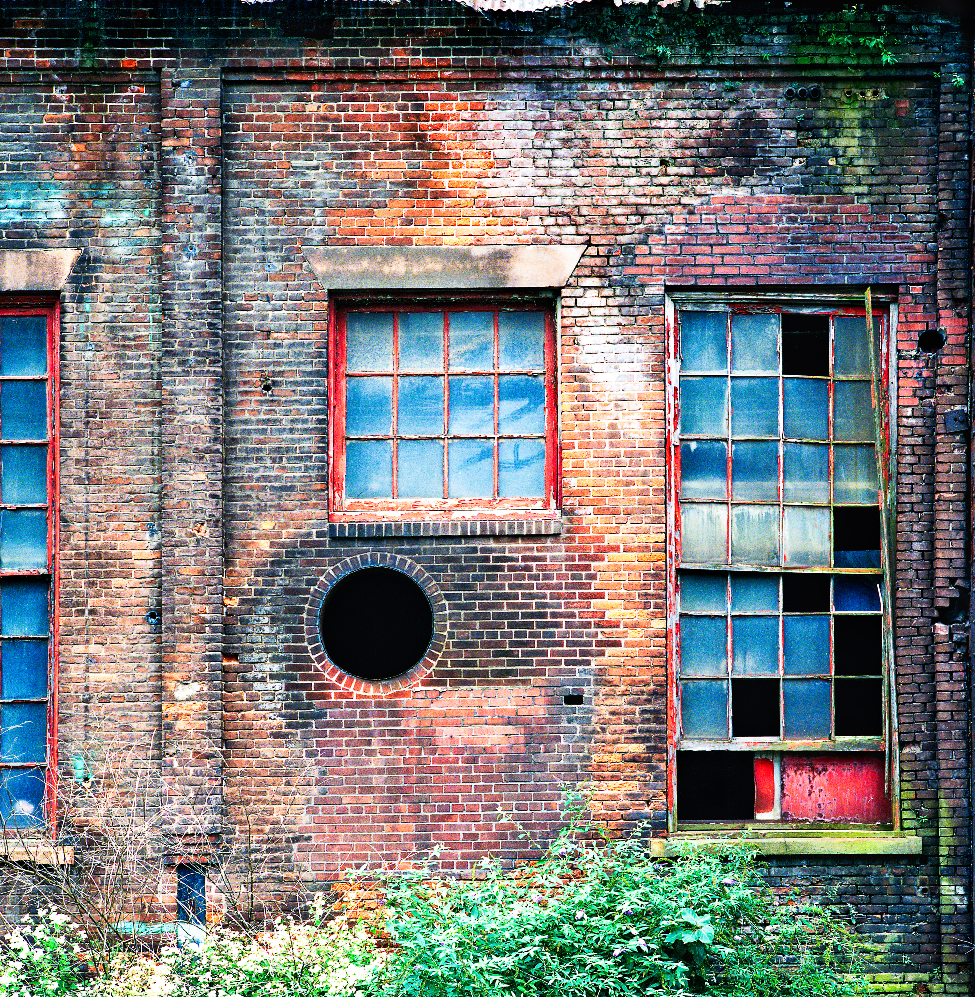 Old brick red wall of the remnants of Bethlehem Steel. The color and textures, as well as the shapes, were irresistible to my camera. Photographed on film with medium format film camera (Hasselblad)
