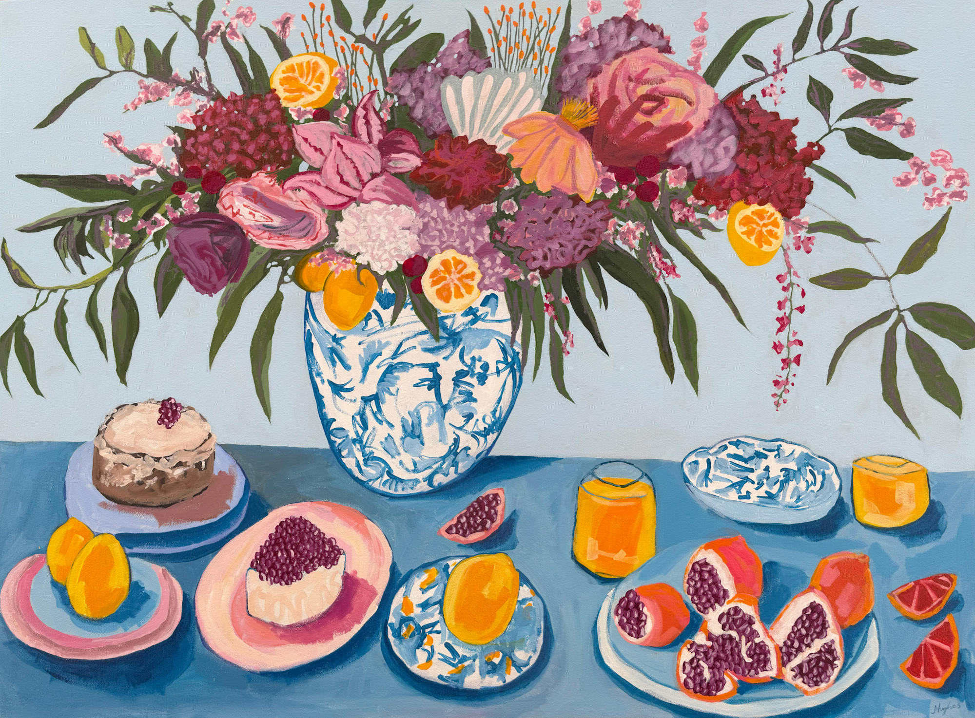 Casual Arrangements is anything but casual, it’s a lavish, sun-drenched daydream dressed as a still life. Lush florals spill generously from an ornate vase, tangled with citrus slices and soft leaves, while a table below is set with ripe fruit, delicate cakes, and gleaming glasses of juice. Every detail is a small celebration, every colour chosen to whisper joy.