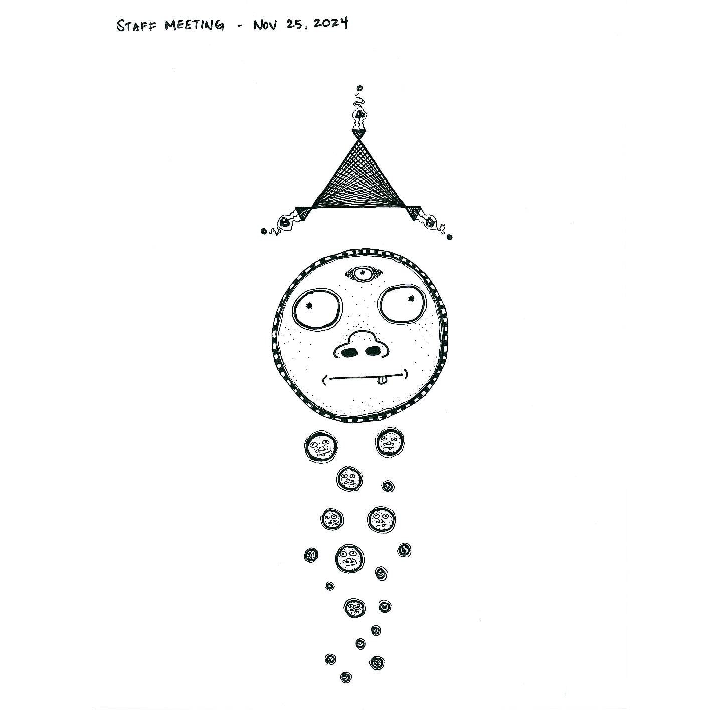 During a staff meeting on November 25, 2024, I created this ink drawing, which I see as a fusion of humor and mysticism. The central figure—a large, expressive face with a third eye and exaggerated features—represents, to me, a sense of authority laced with confusion. Beneath it, smaller versions of the same face cascade downward, symbolizing the fragmentation of thought or perhaps the multiplicity of identity within the monotony of professional settings.