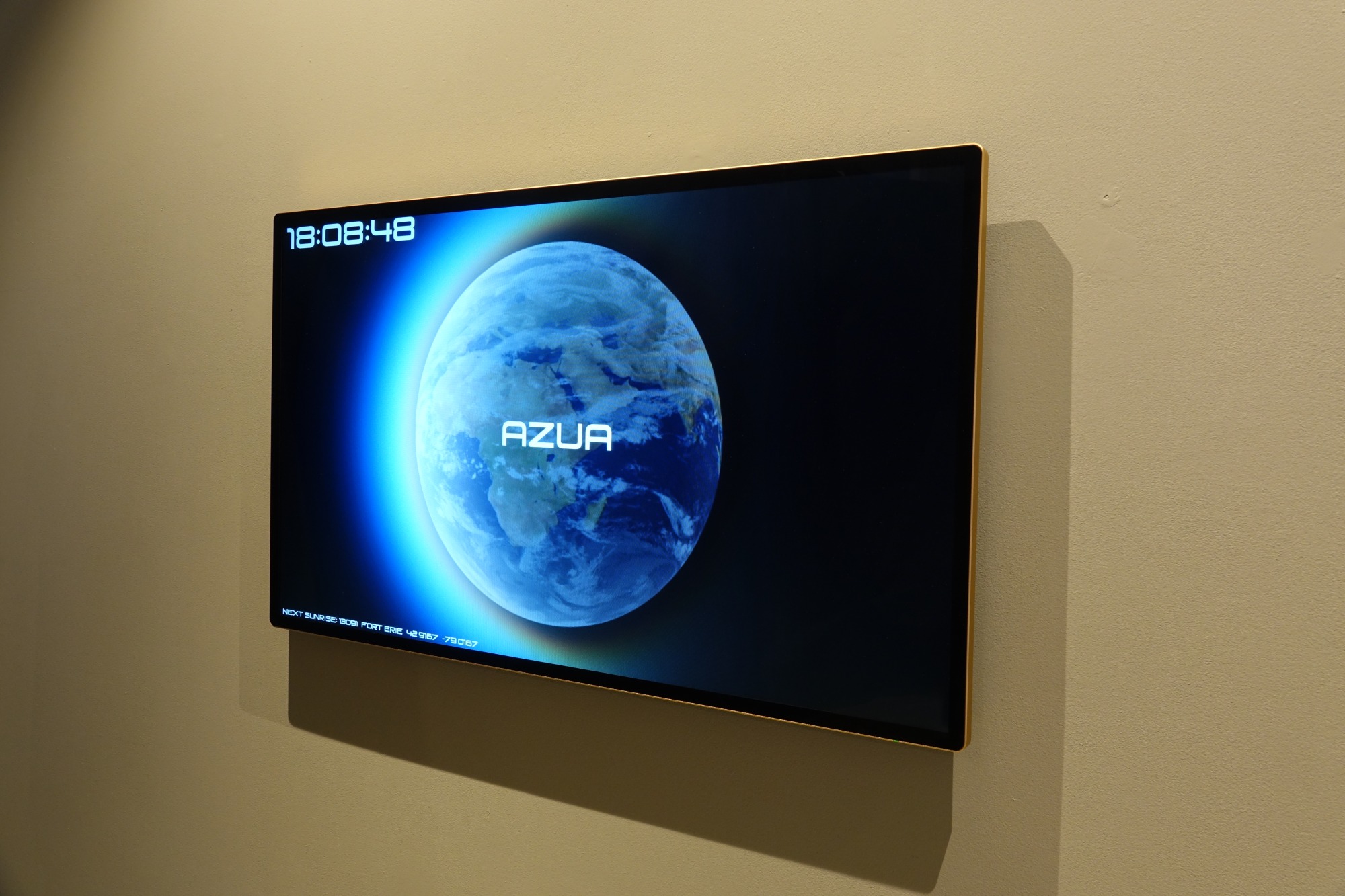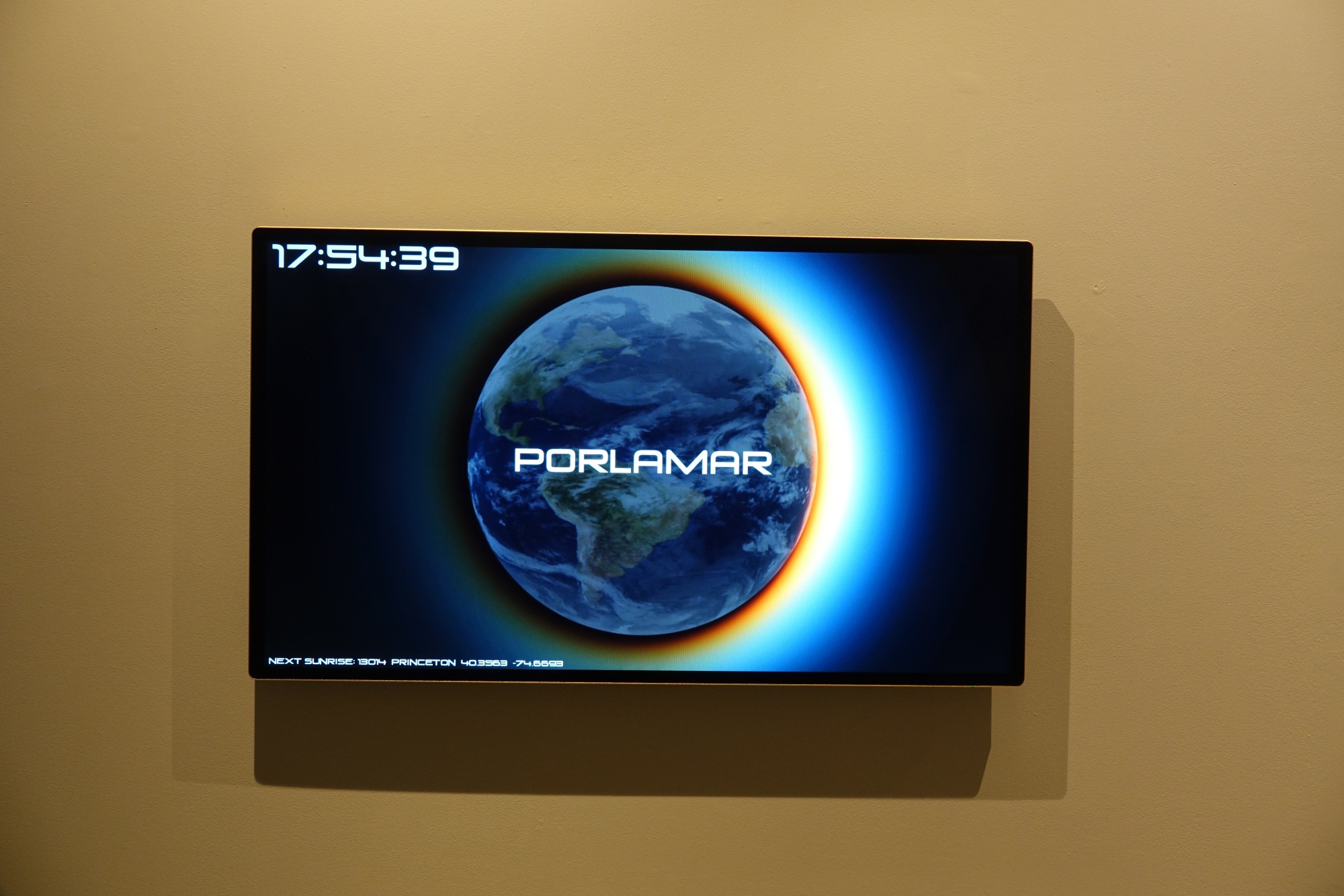 Technical : A database with the LNG and LAT of 26,000 cities is sent to a web API that sends back the sunrise and sunset times for those positions on Earth. Then every minute the computer pulls the data entry for that slot adjusted for the timezone difference of the current viewing location ( Manila, Philippines). The list is constantly updated to account for the changing solar arc. Programming lead Jorg Avila.