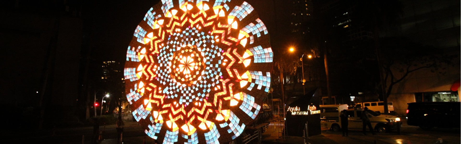 I Can’t Tell You What I Don’t Know, Only That I Don’t Know by James Clar visualizes the process of understanding language and culture. The cylinders, which trigger the lights on the massive 20-foot diameter parol, is wrapped with a written version of Lupang Hinirang that was spoken to James while in New York on the phone by Corinne De San Jose (a locally born artist). James, a diaspora Filipino who in the last year moved to the Philippines, wrote down what he interpreted as the language. This letter, with notes and errors, was then sent to the curators of Ayala Museum who amended it to the correct version.