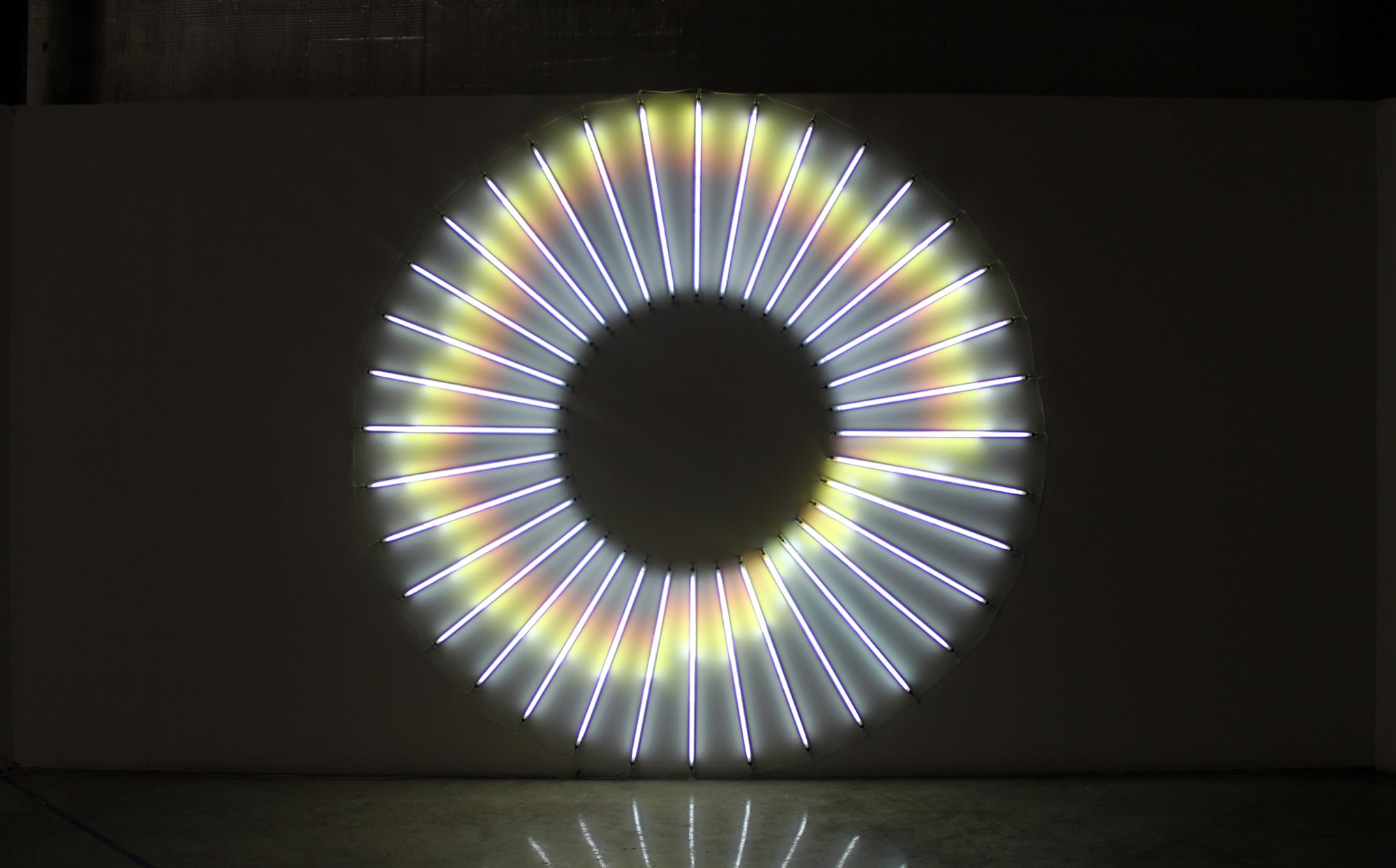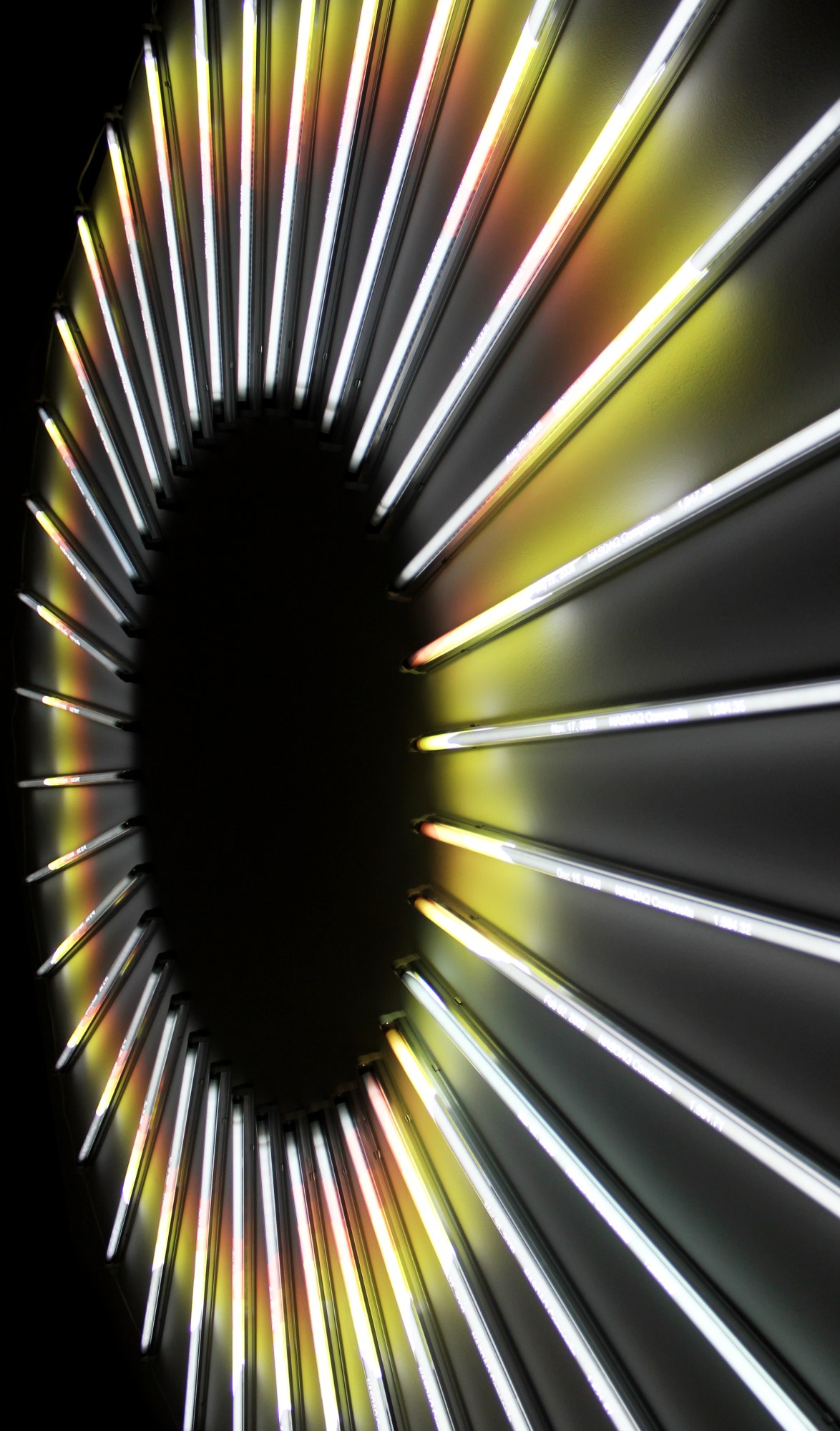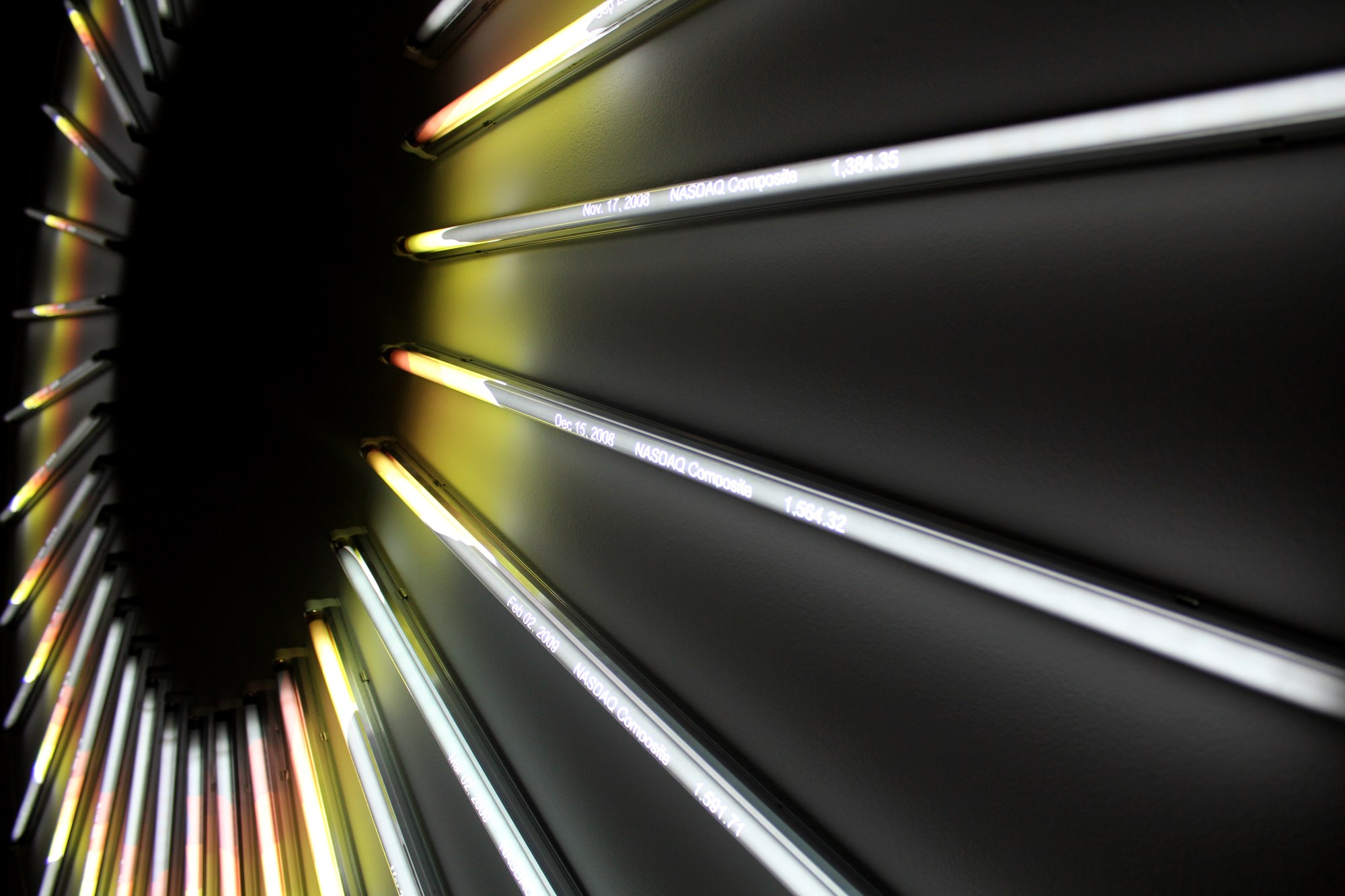 "NASDAQ Recursive Loop maps NASDAQ data from October 2007 till February 2011 onto a large circle of light. The higher the stock value the further from the center the line of light is shown. Starting from the top and going clockwise; the line shows the recession hitting around 2008 and slowly recovering, until Feb 2011 when the value is the same as before the crash in Oct 2007.
