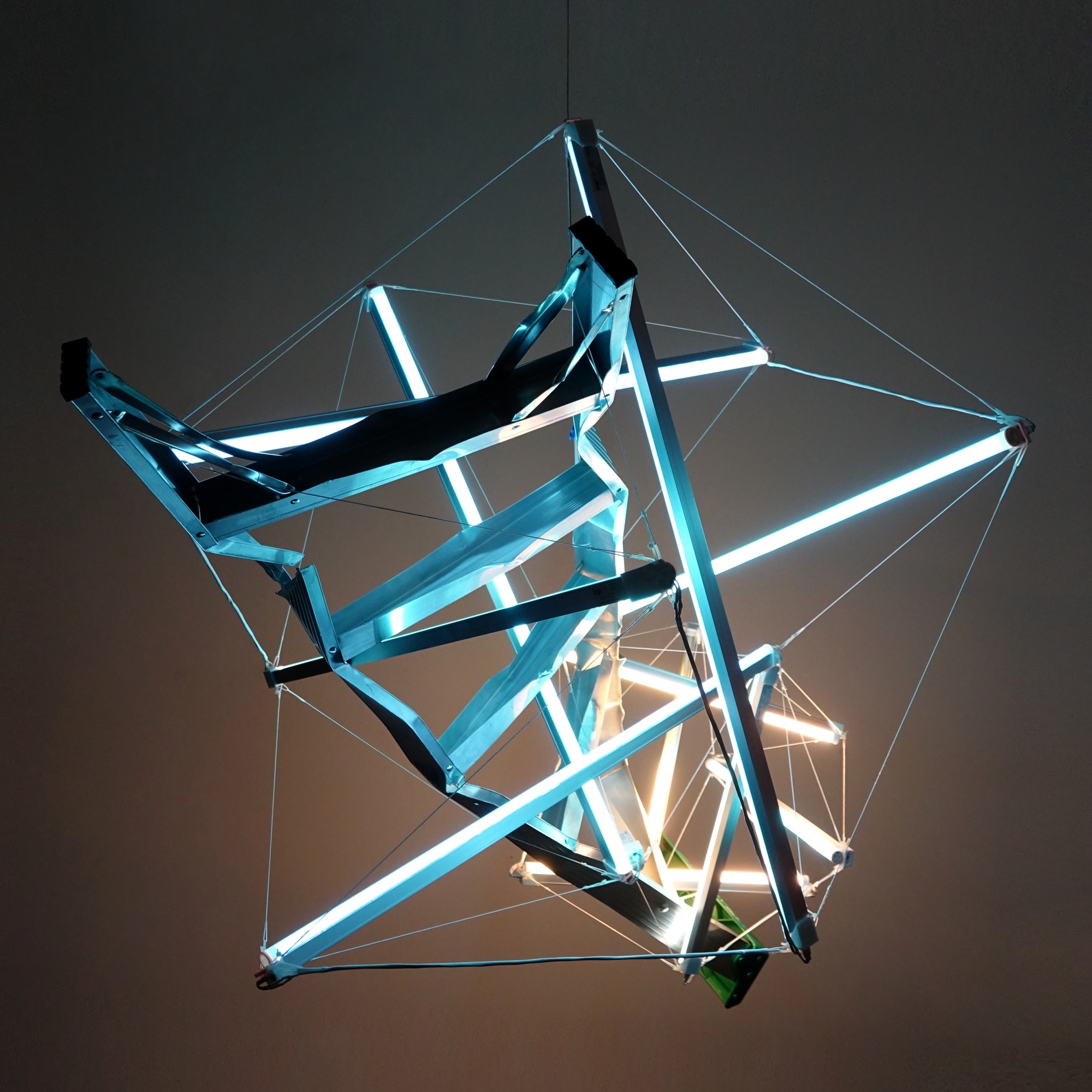 A twisted ladder is intersected with light geometry. The ladder's functionality is erased while it floats, referencing a virtual or simulated space where gravity is not a constant but a variable that can have positive and negative values.