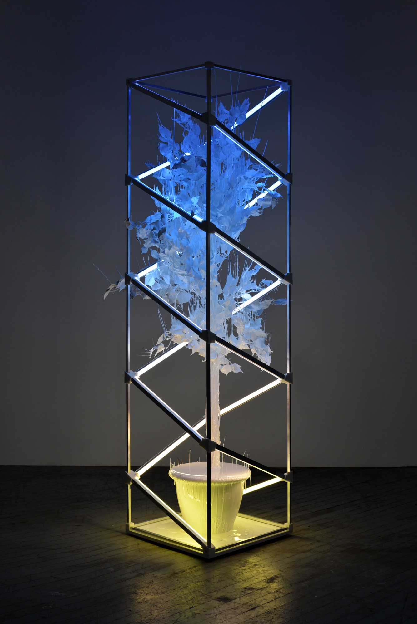 A freestanding sculptural work representing nature rendered as a holographic simulation. The tree emanates from a white viscous substance, while blue and yellow LED lights reflect off of it. The name Render(Tree); refers to a fictional line of computer code calling the tree into existence.