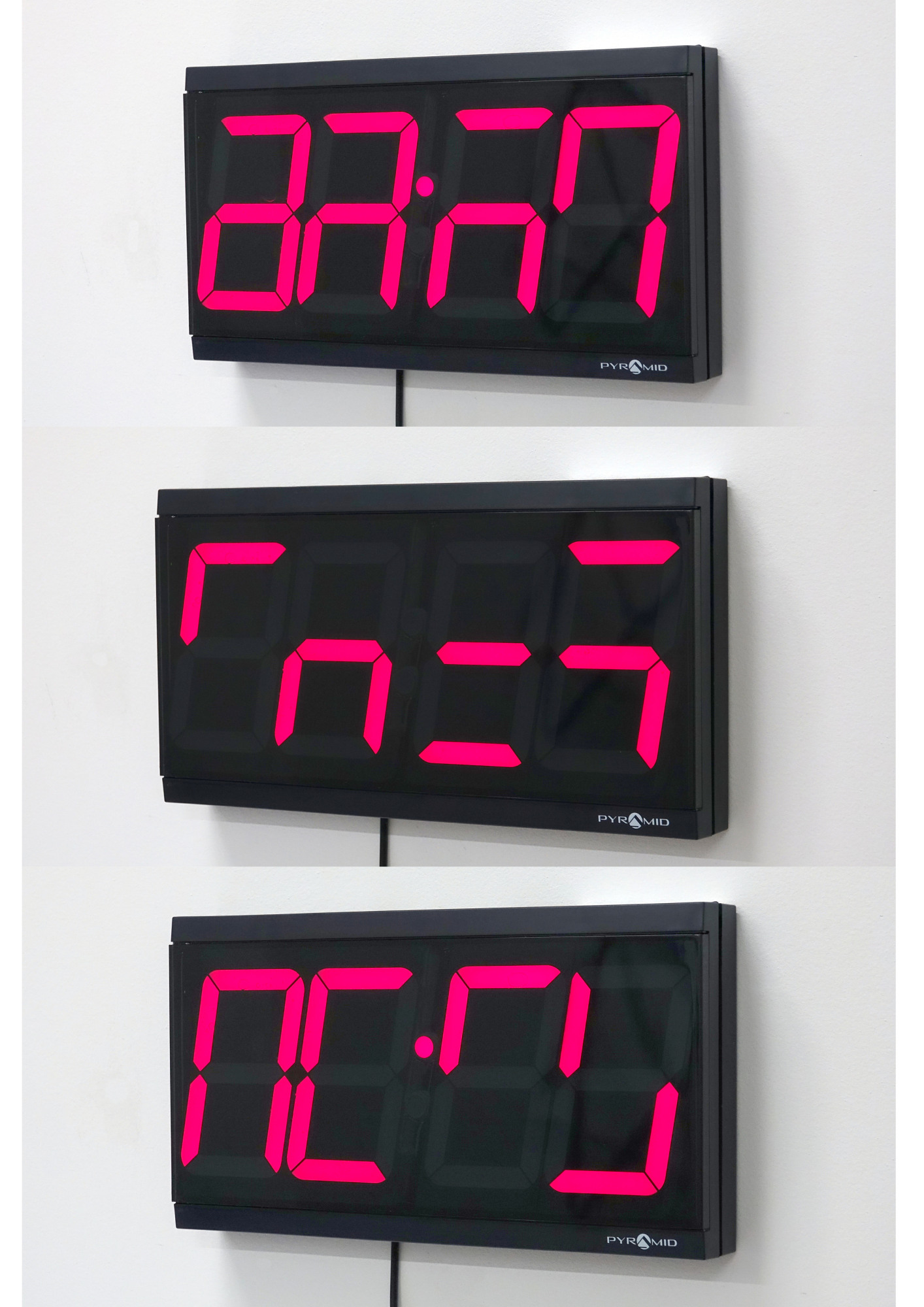 A digital clock is reprogrammed to generate random patterns on its display every 45 – 60 seconds. It is a visual system for eroding the symbols of numbers, their given shapes and meanings. It also calls into question time as set increments versus experiential time, which can vary. Technology has had this dual polarized effect of increased systems of measurement yet decreased psychological awareness of ‘the now’. The internet and so- cial networks have instead spread ourselves over many time zones and spaces.