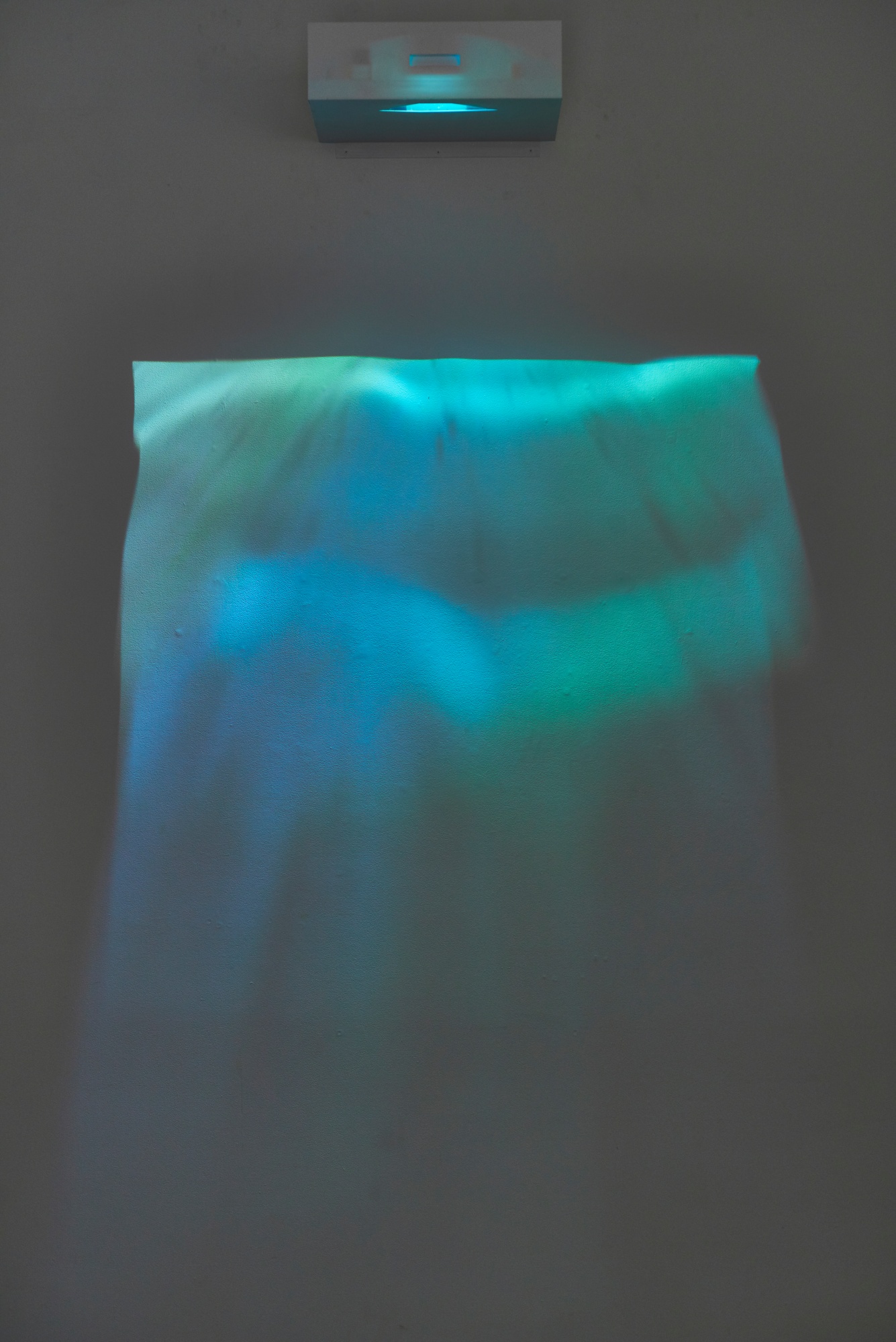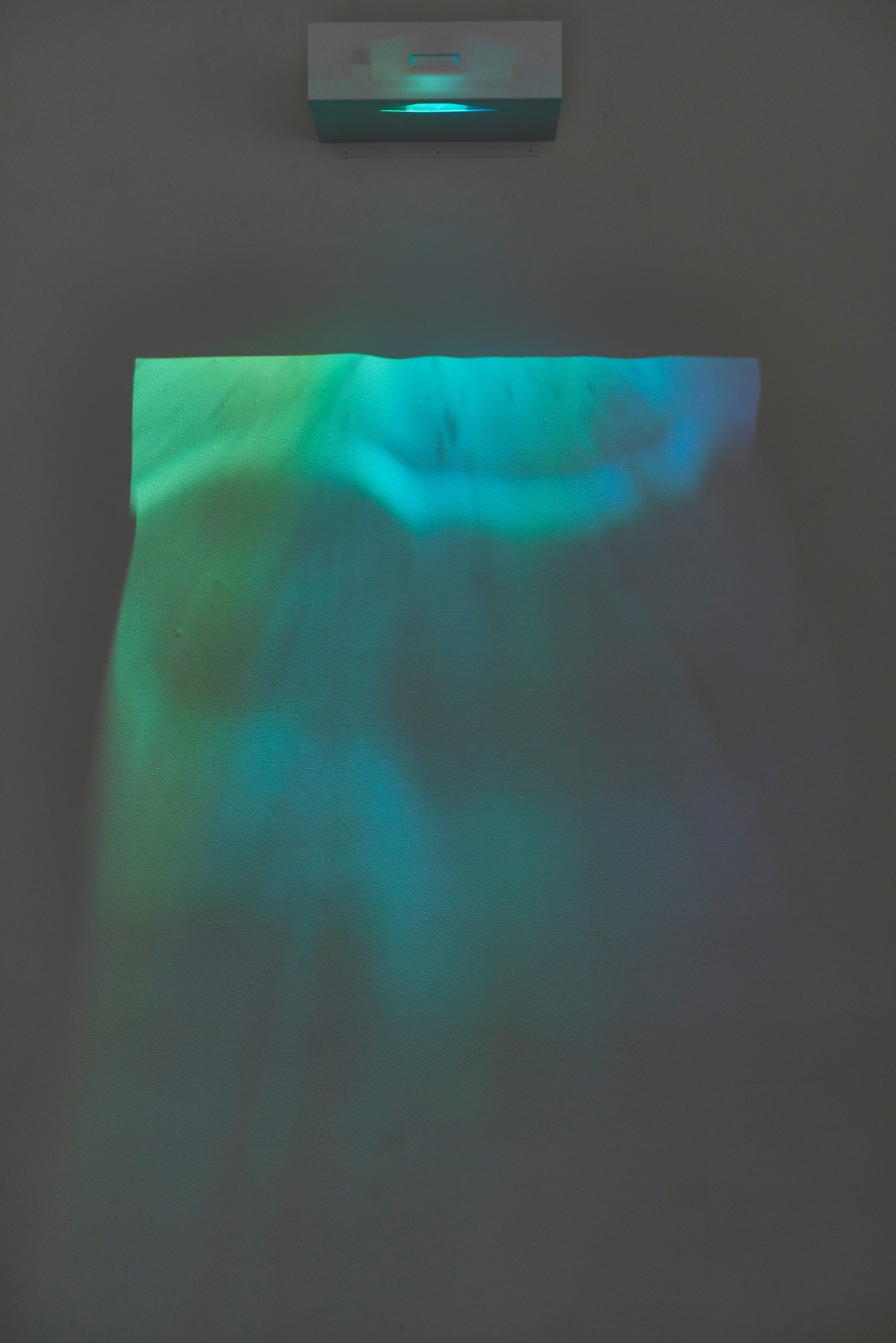 In “The Ether” the artist has created an analog animation machine that distorts light through mechanized waves of liquid. It is the hypothetical ‘non-space’ of the internet, a visualization of the ether that propogates light and information."