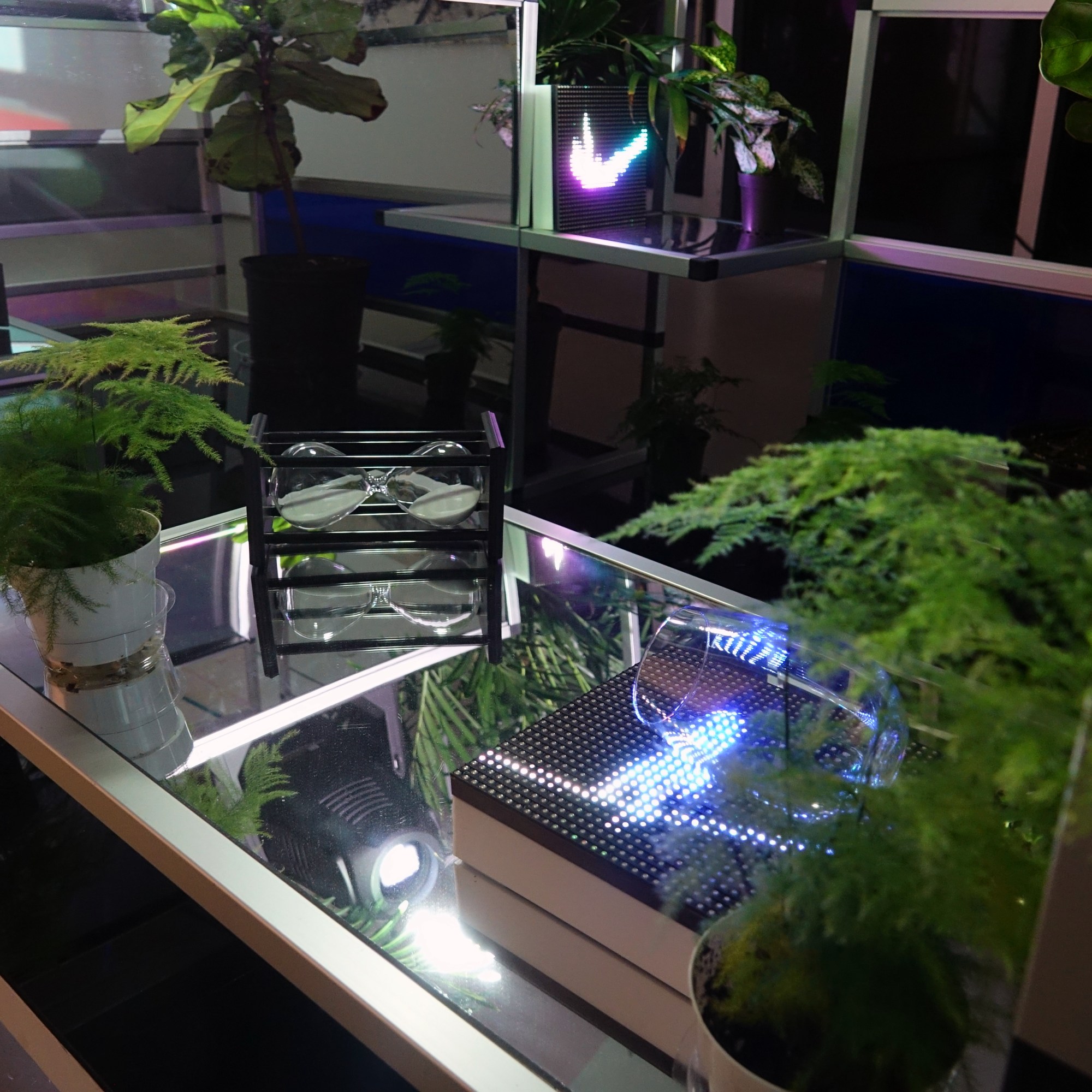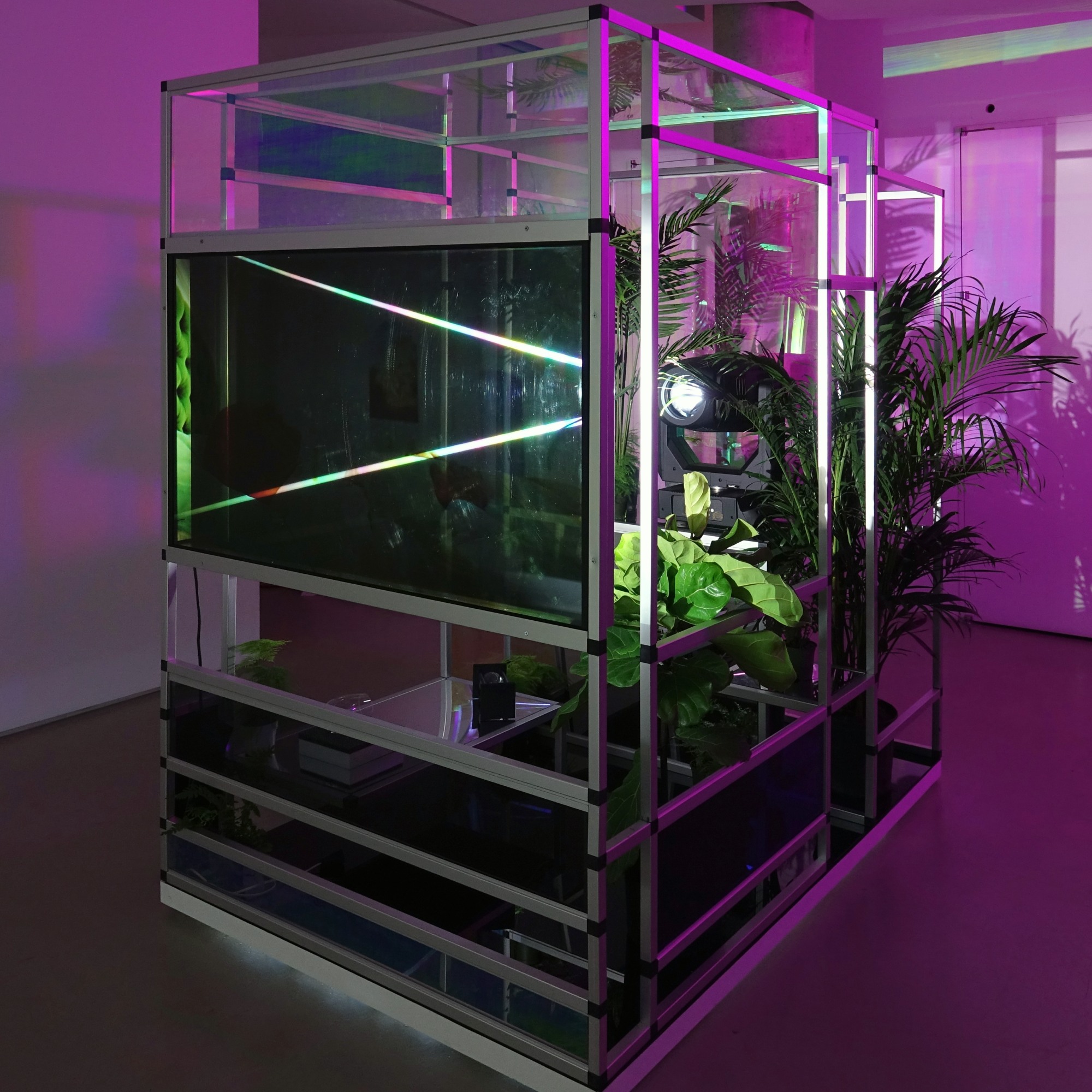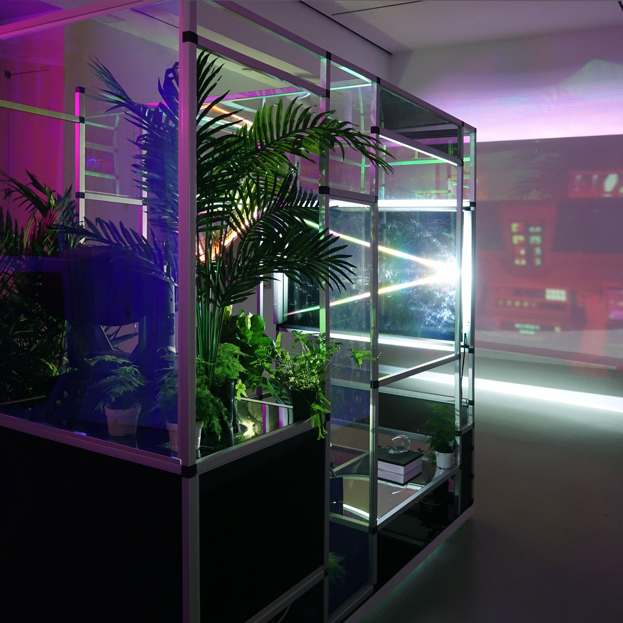 This combined video is played on a transparent LCD screen mounted in the structure. A spotlight shines through the transparent LCD, casting the colors of the video onto the gallery wall.