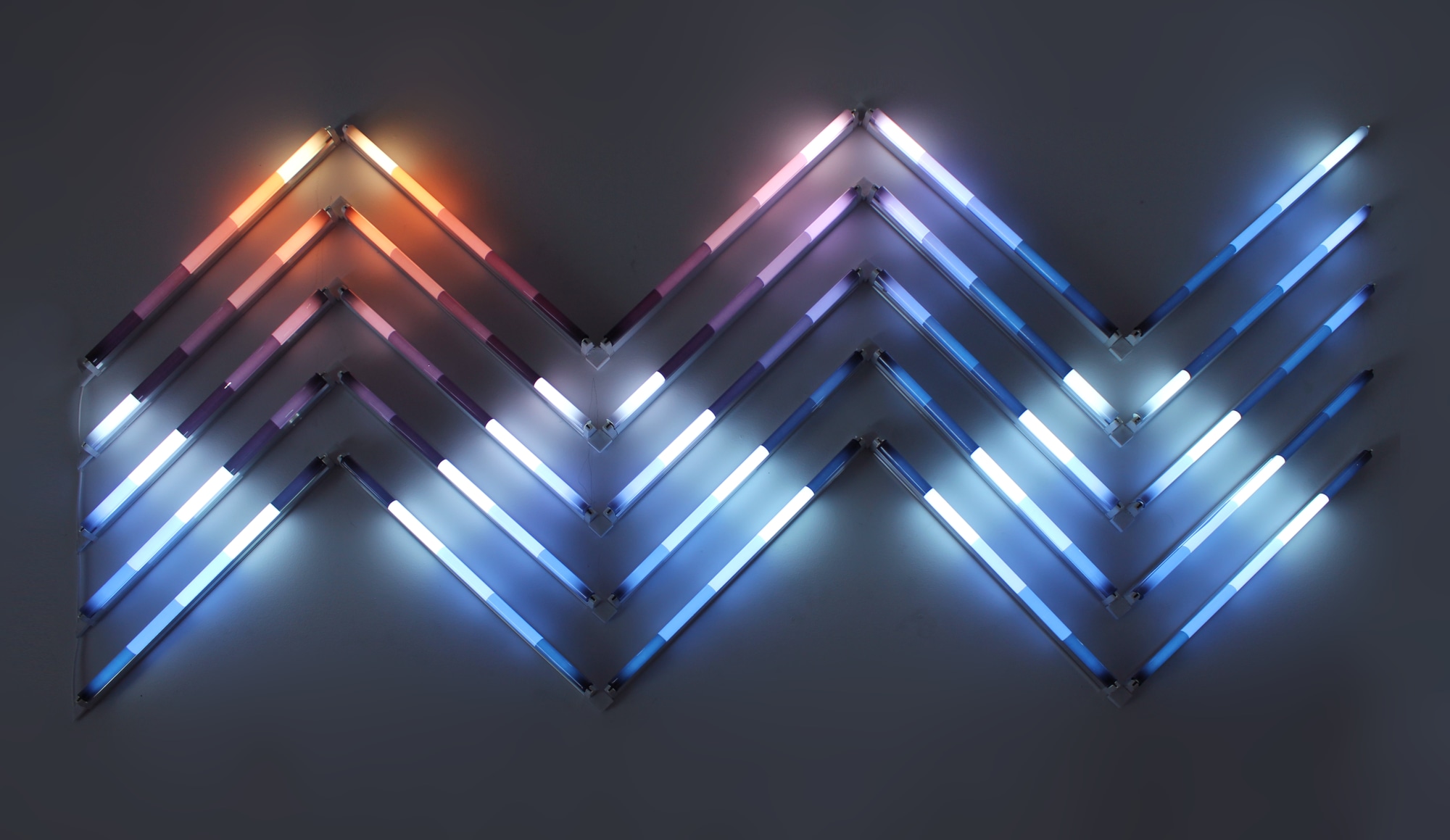 Here the physical lights are mounted in a wave pattern. Within the lights is another pattern of waves created through color, this is the reflection of waves on themselves. In the upper left reddish colors come though, this is the sun setting behind the waves.