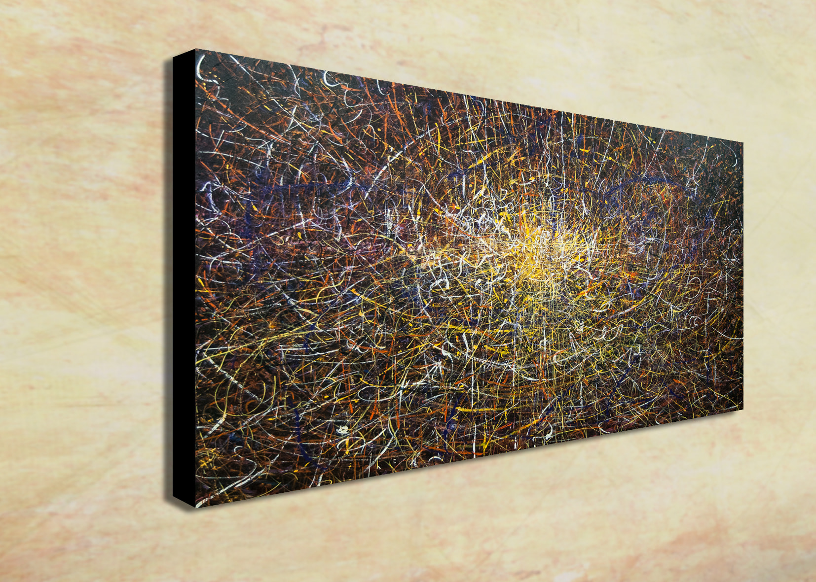 A large energetic painting inspired by sub- atomic particle movements in the Large Hadron Collider. An attempt to convey the seemingly random movements generated by high-speed particle collisions using brush strokes and colour