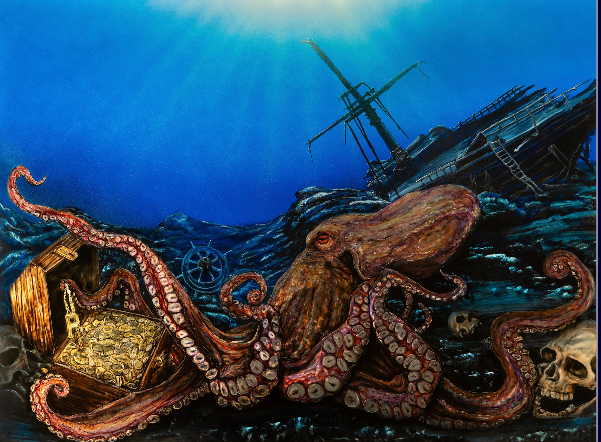 The krakens skin is forever amorphous! Lots of reflections and hidden neon's highly light sensitive. UV safe and archival.