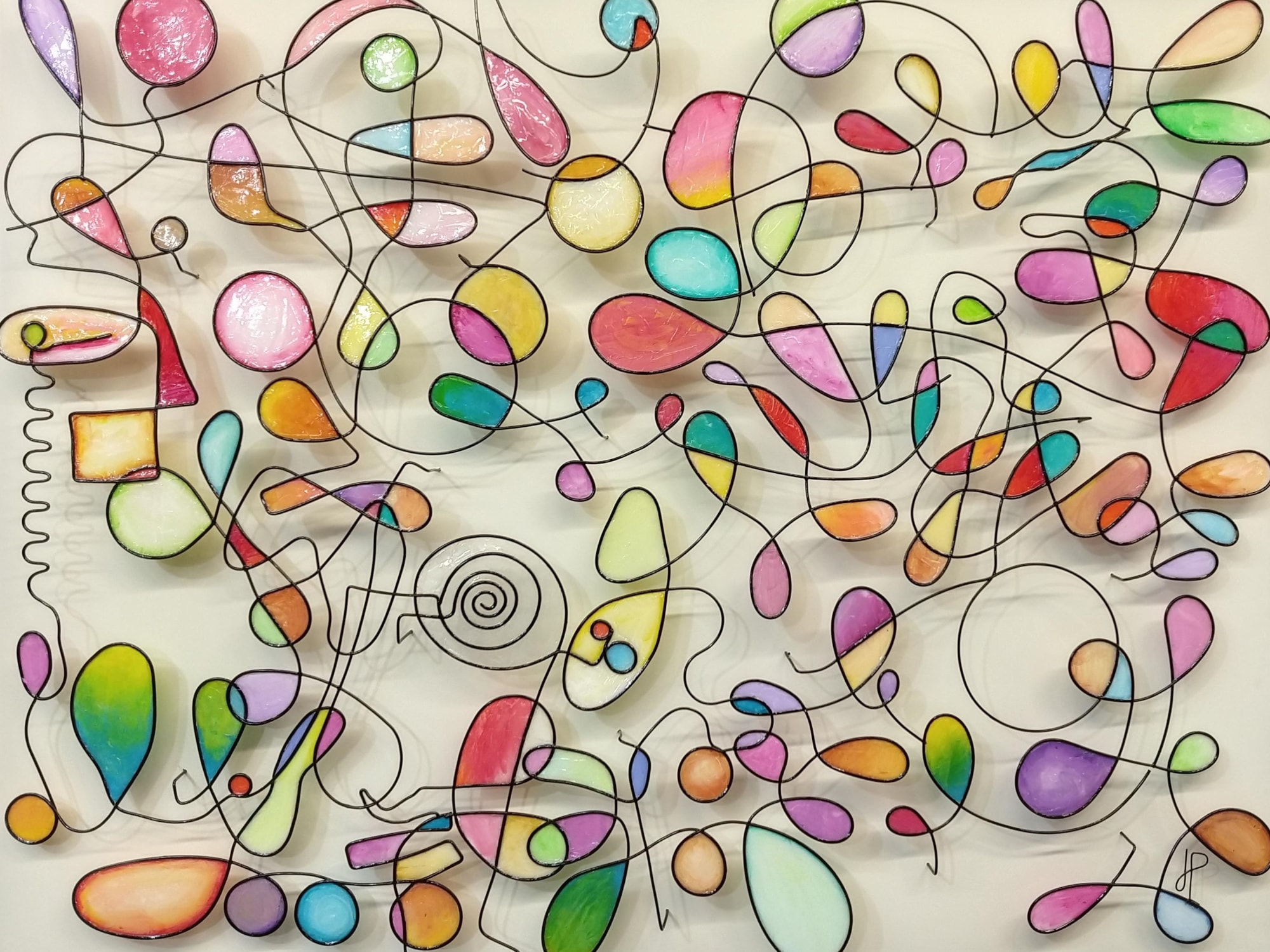 I build machine-like objects, twisting pieces of wire to create structures, then adding colour. Some have interactive moving elements. All are exquisite.