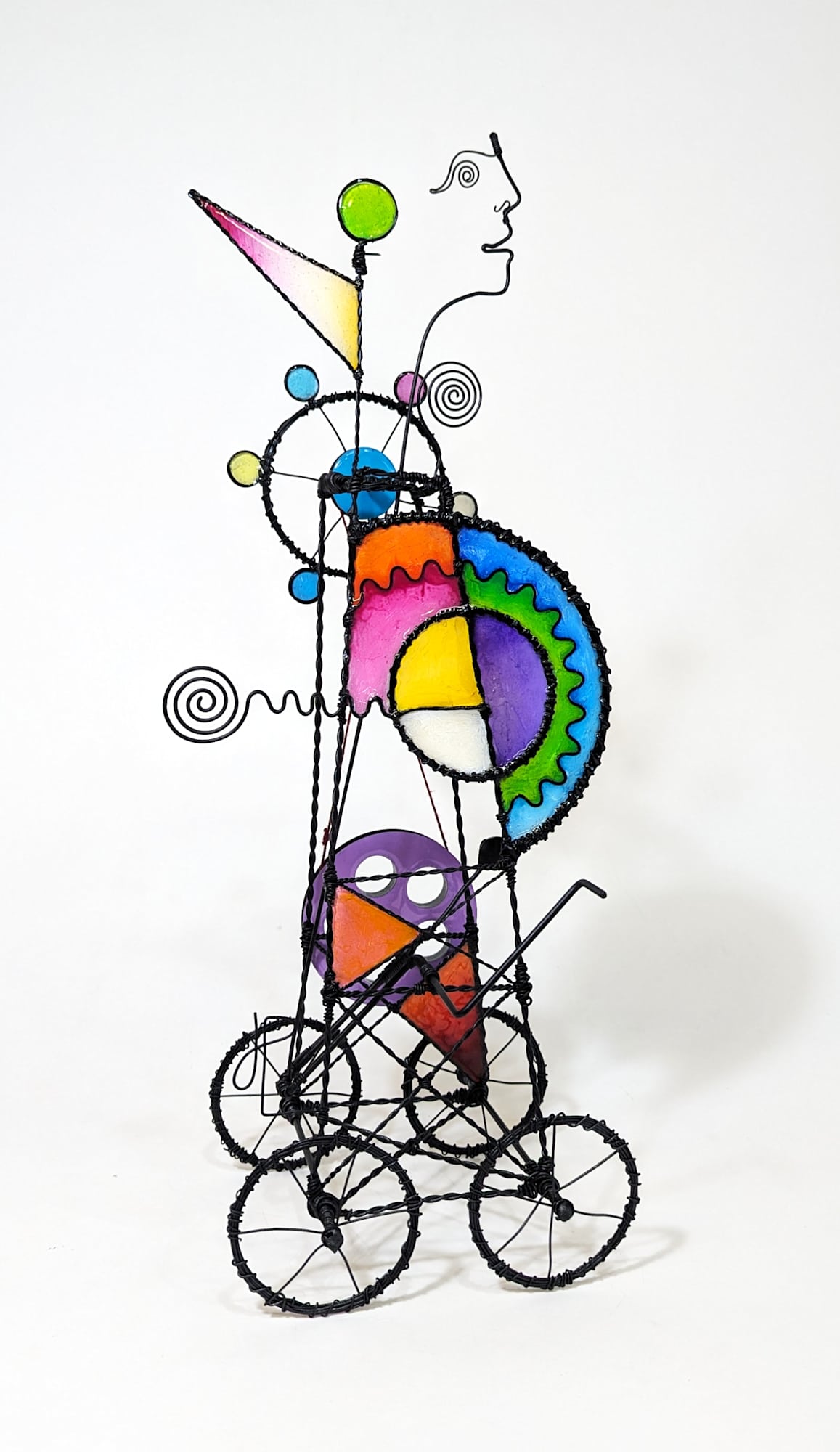 I build machine-like objects, twisting pieces of wire to create structures, then adding colour. Some have interactive moving elements. All are exquisite.