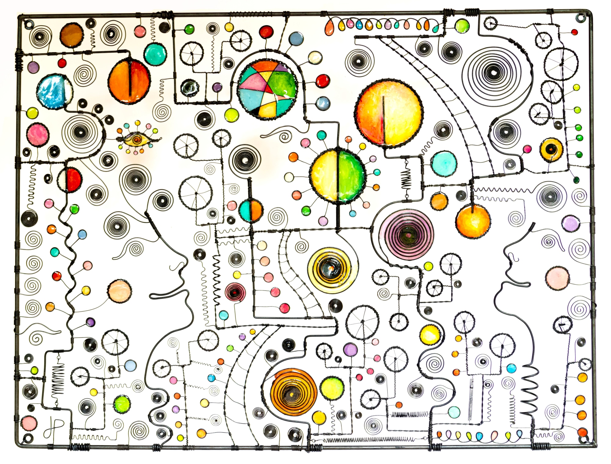 I build machine-like objects, twisting pieces of wire to create structures, then adding colour. Some have interactive moving elements. All are exquisite.