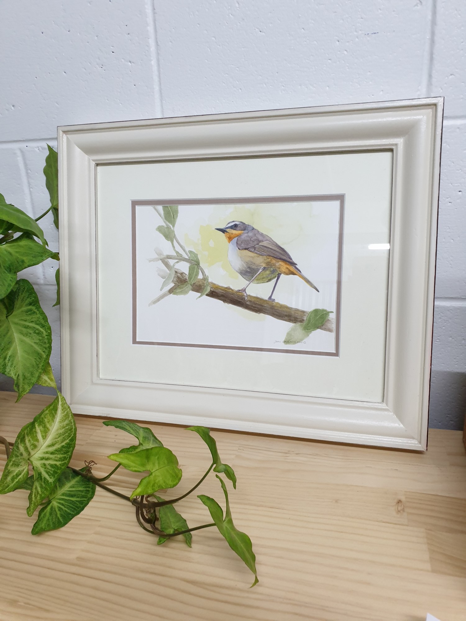 Framed in a cream wood frame with distressed edges and a pale yellow mat.