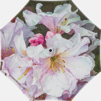 These very unique rainproof umbrellas really make a statement! Two designs are available, both featuring prints from Jan's floral watercolour paintings.