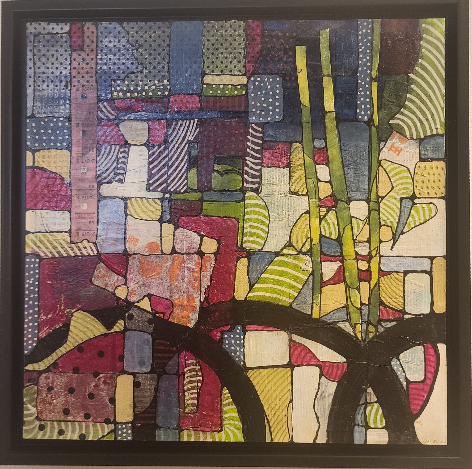 Acrylic paint and paper collage on cradled wood panel, framed in black floater frame