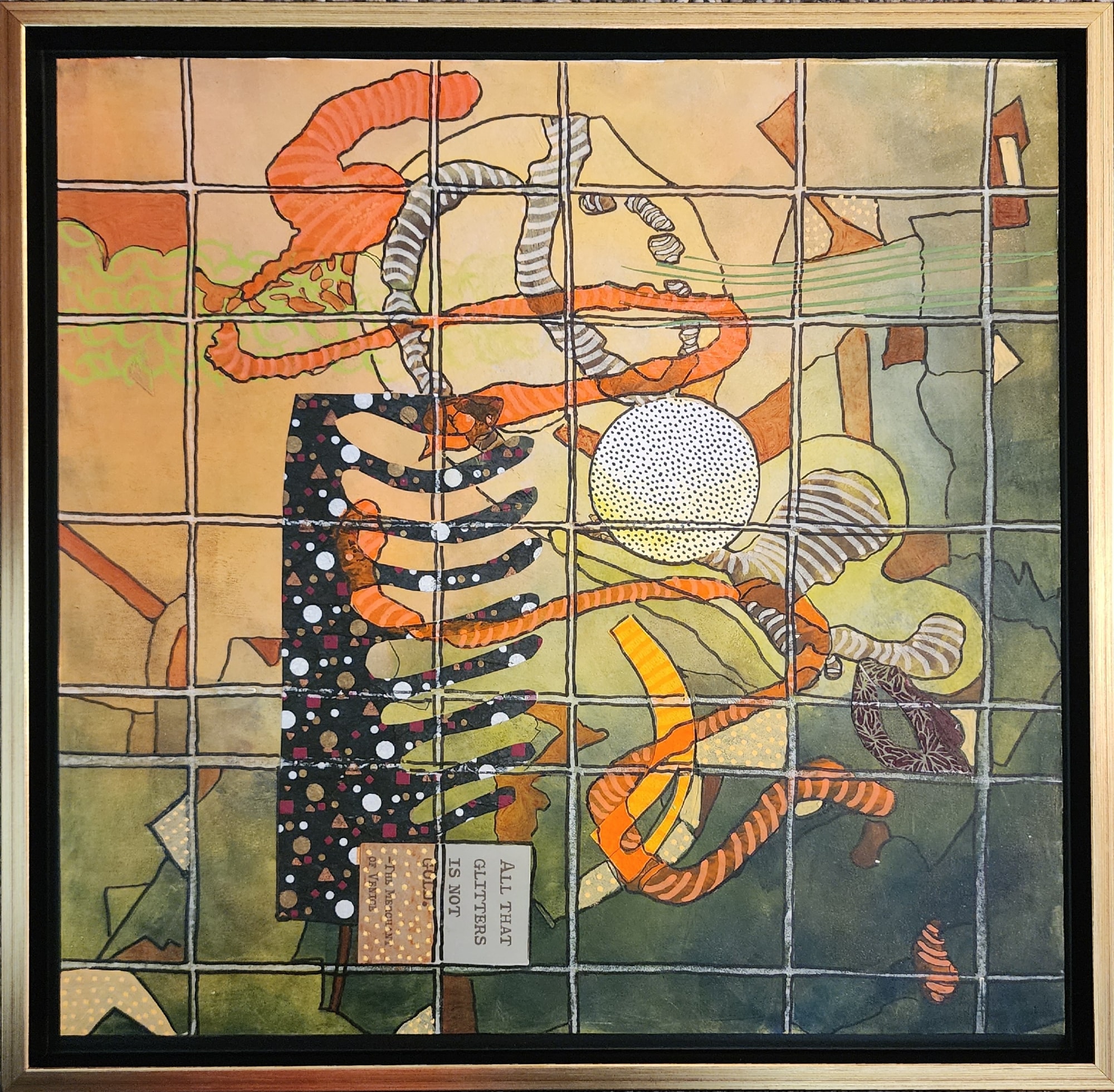 Acrylic paint and paper collage on wooden cradled board, frame in gold and black floater frame