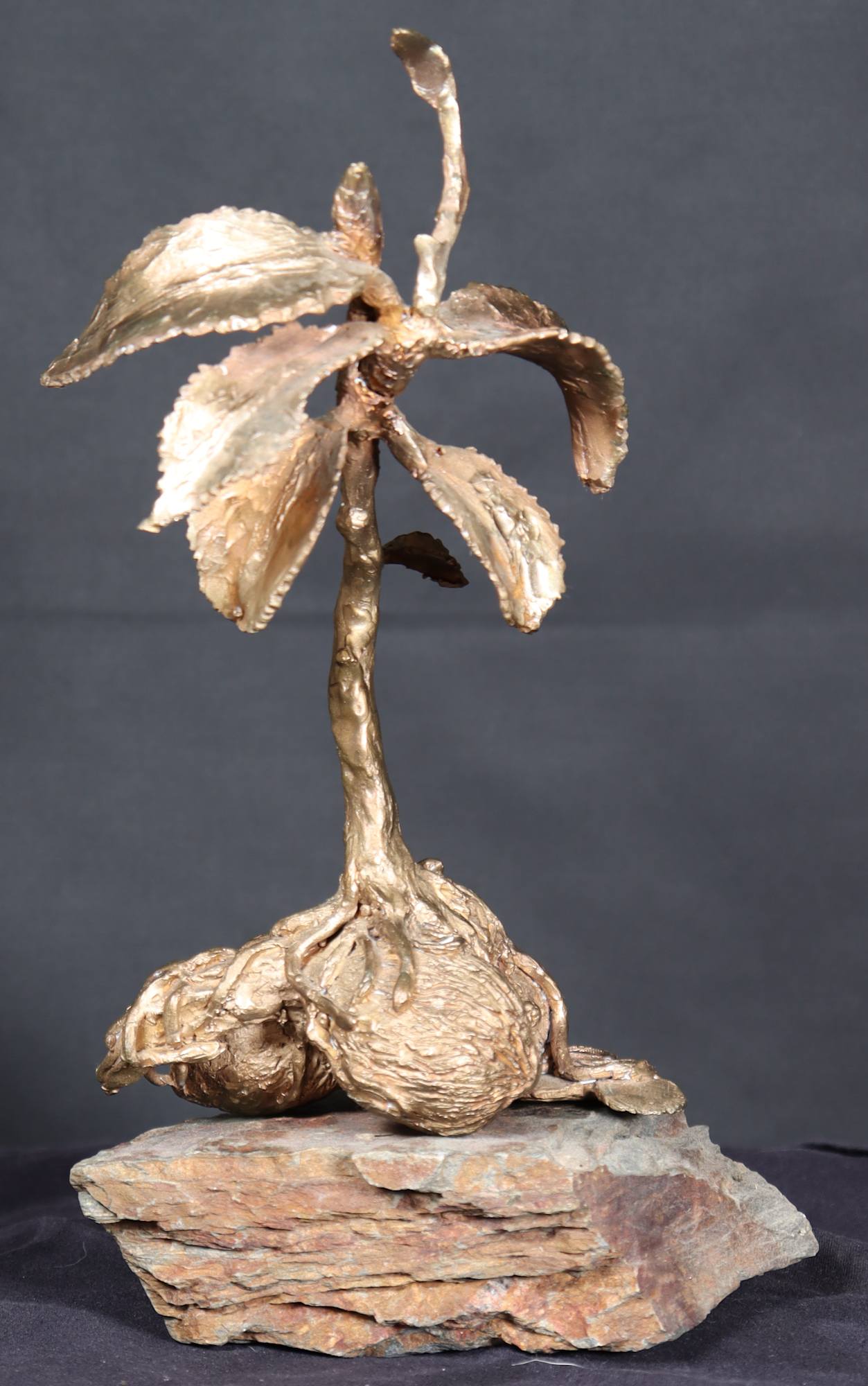 The sculpture was created representing black walnuts growing into a tree. As the tree grows the roots and Twine first a pair of wedding rings, money in the form of coins, and a key to a home creating a life together as they become entwined and grow strong and tall.