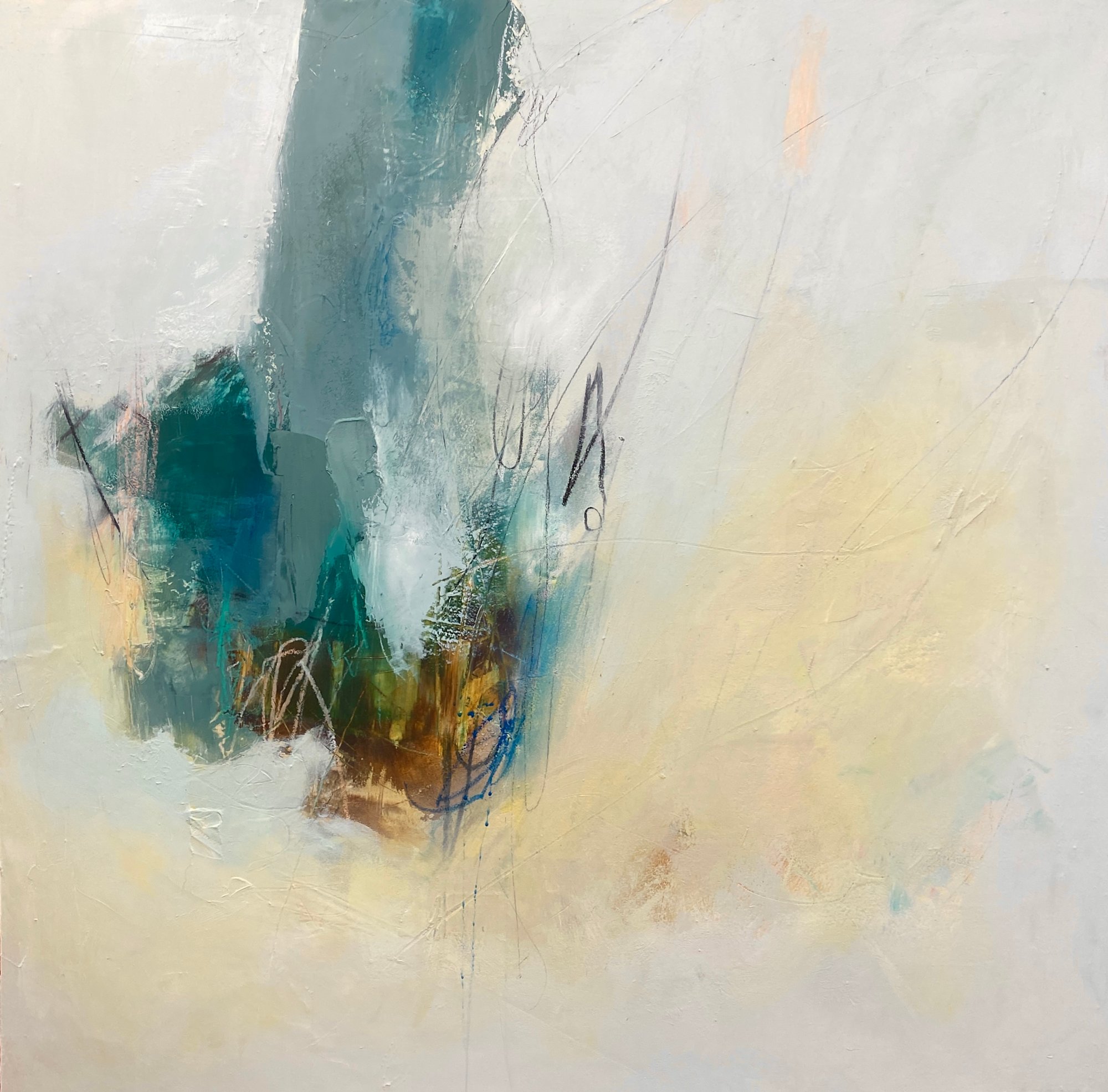The rapid mark making and loose application of tonal blues create a centrifuge that expresses energetic movement focussed on one spot.