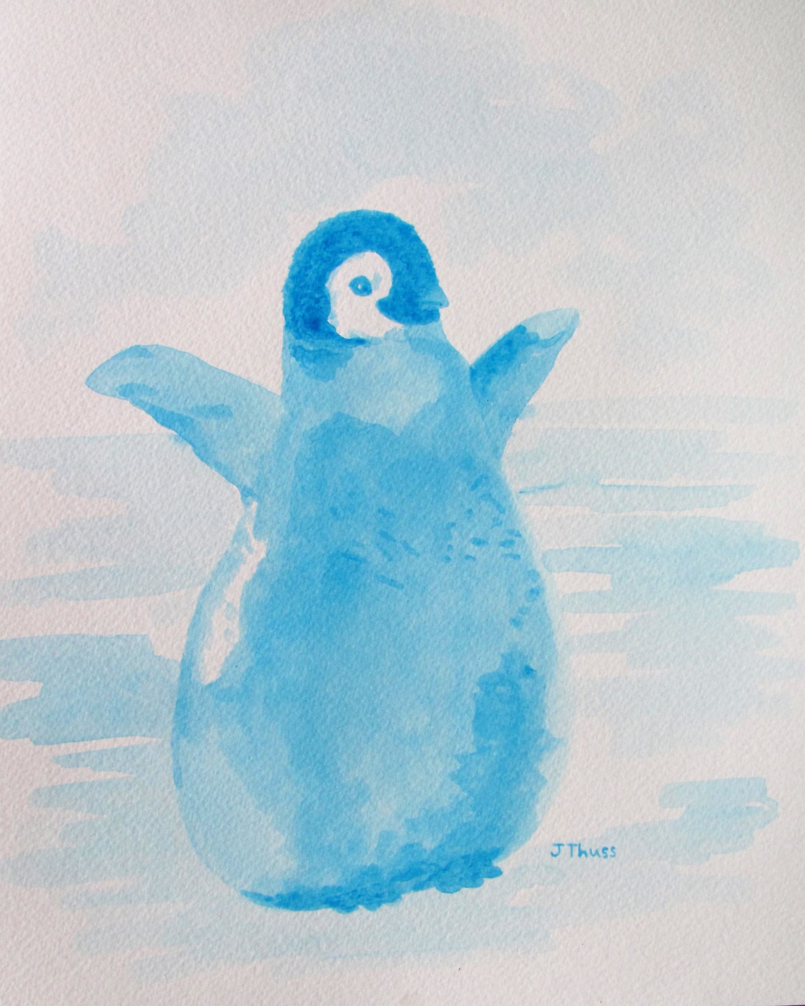Acrylic painting on 140 lb cold-pressed, acid-free watercolor paper, of a happy baby penguin in blue.