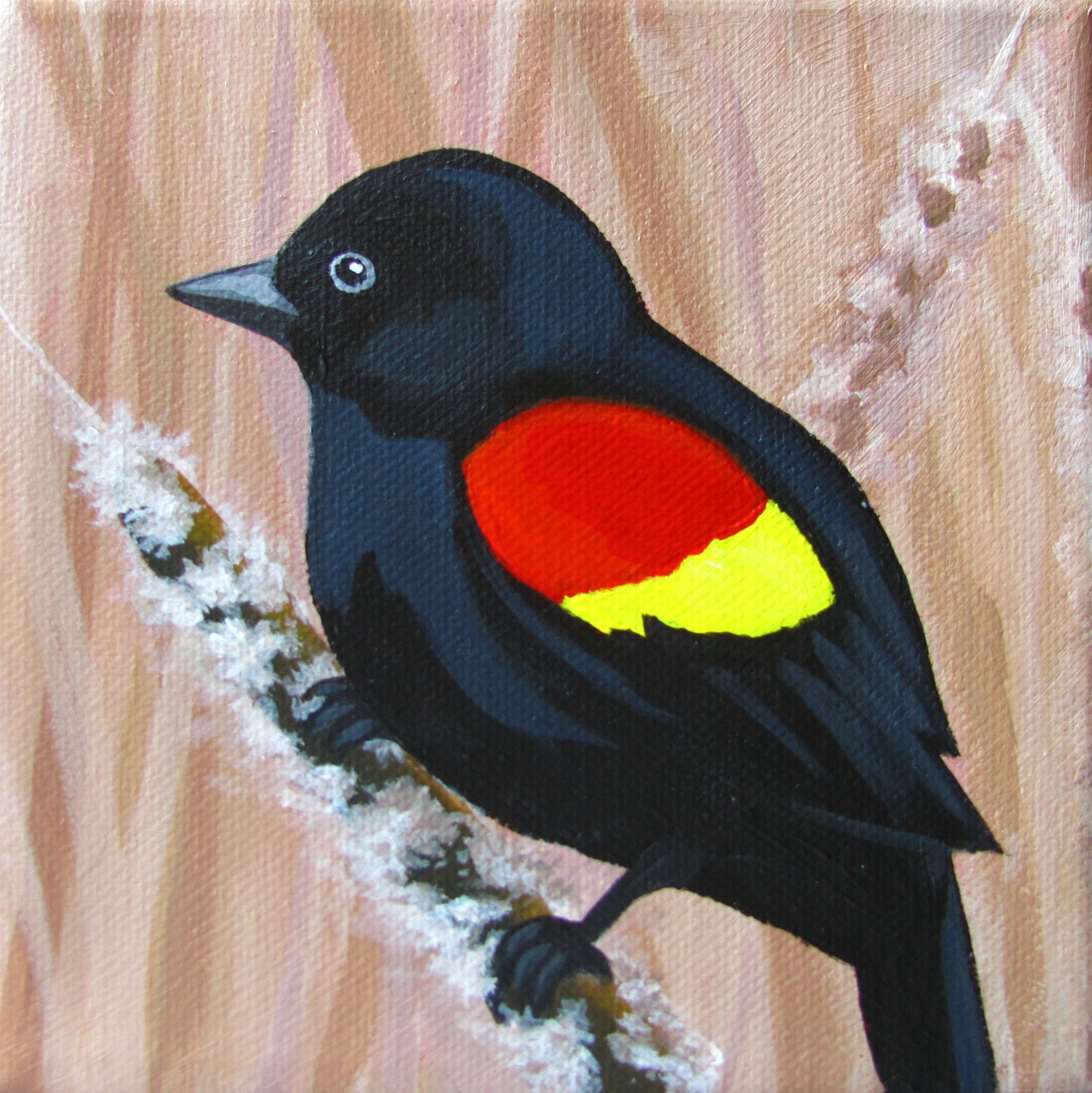 A Redwing Blackbird perches on a bull rush, in a field of bull rushes.