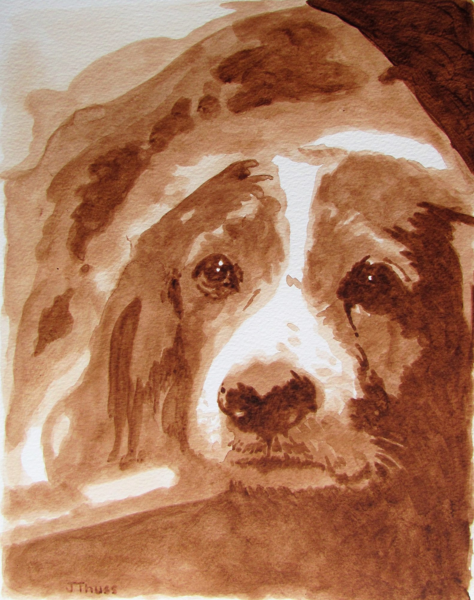 A sad looking spaniel dog painted brown with acrylic paint on acid free watercolor paper.